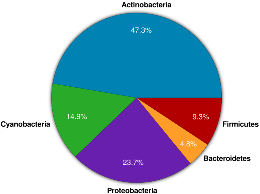 The phylum Actinobacteria represents one of the largest taxonomic units among the 18 major lineages currently recognized within the domain bacteria []. The subclass Actinobacteridae includes the order Actinomycetales, members of which are commonly referred to as actinomycetes. These are Gram positive bacteria characterized by their ability to form branching hyphae at some stages of their development []. Within the order Actinomycetales, approximately 49 families have been recognized with the most common ones being Actinomycetaceae, Actinoplanaceae, Dermatophilaceae, Frankiaceae, Mycobacteriaceae, Micromonosporaceae, Nocardiaceae, and Streptomycetaceae, comprising altogether 147 genera [,]. Actinobacteria are widespread in nature and have been recovered from a wide variety of terrestrial habitats, where they exist as saprophytes, symbionts or pathogens [,,]. Actinomycetes have been cultivated from the marine environment including sea water [], marine snow, and marine sediments []. Actinomycetes have also been cultivated from different marine invertebrates [,,], with the majority being isolated from sponges [,]. Marine actinomycetes produced a multitude of novel lead compounds with medicinal and pharmaceutical applications. Figure 1 shows the percentage distribution of compounds obtained from marine sponge-associated bacteria. Here, actinomycetes account for approximately half of the natural products (MarinLit database 2013 (John Blunt, MarinLit, University of Canterbury, New Zealand) [,]), (Figure 1). Biological activities such as antibacterial, antifungal, antiparasitic, antimalarial, immunomodulatory, anti-inflammatory, antioxidant, and anticancer activities were reported from sponge-associated actinomycetes [,,,]. These bioactivities are represented by diverse leads of secondary metabolites including polyketides, alkaloids, peptides, and terpenes [,,,,,].