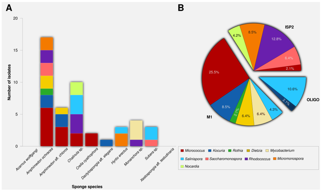 Number of actinomycete isolates (A) per sponge species, (B) per isolation media.