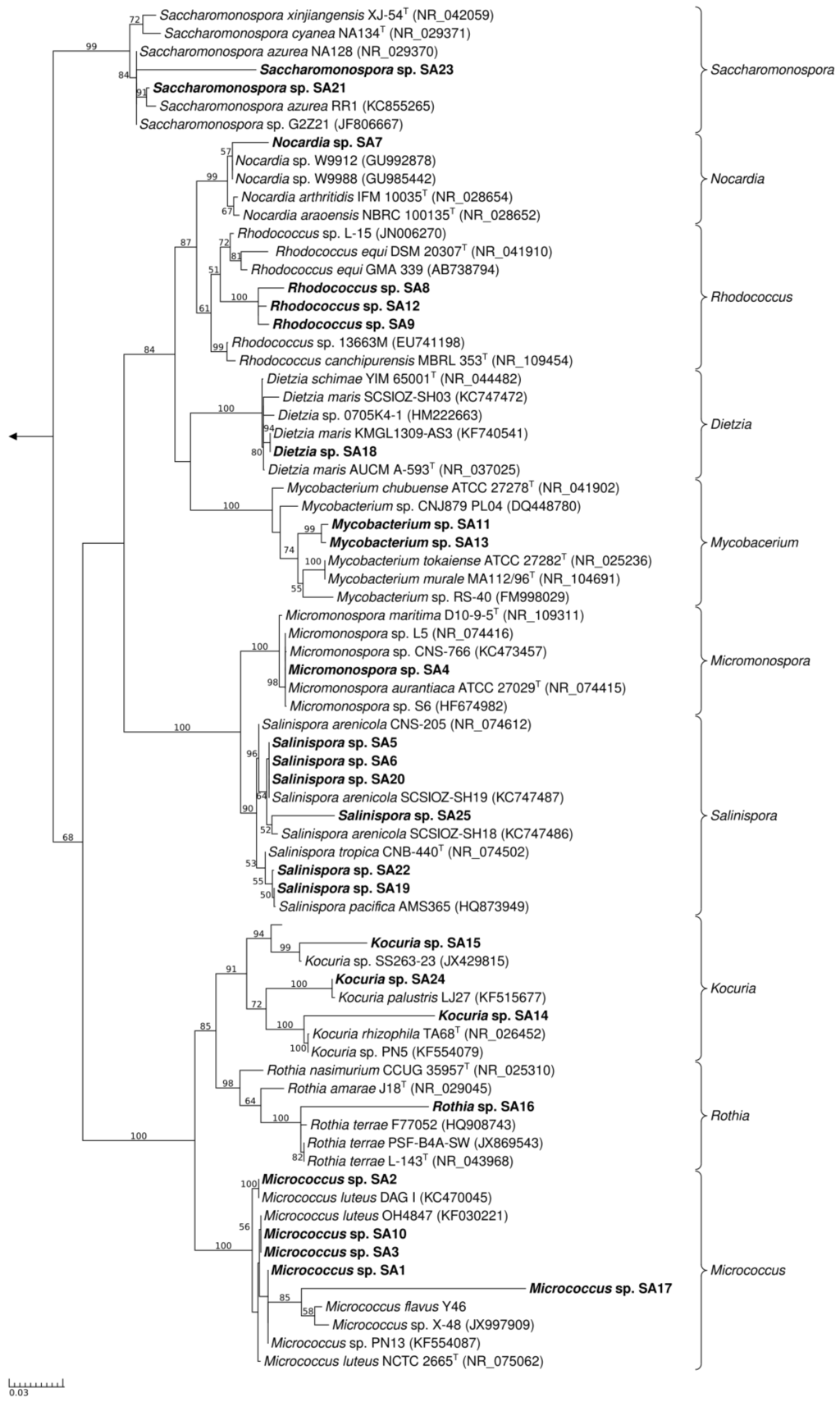 Maximum-likelihood tree of the actinomycete isolates SA1-SA25 (in bold) and their closest phylogenetic relatives based on the 16S rRNA gene marker. Brackets indicate genus-level assignment. Bootstrap values (1000 resamples) are given in percent at the nodes of the tree (greater than 50). The arrow points to the outgroup (Escherichia coli KTCT 2441T).