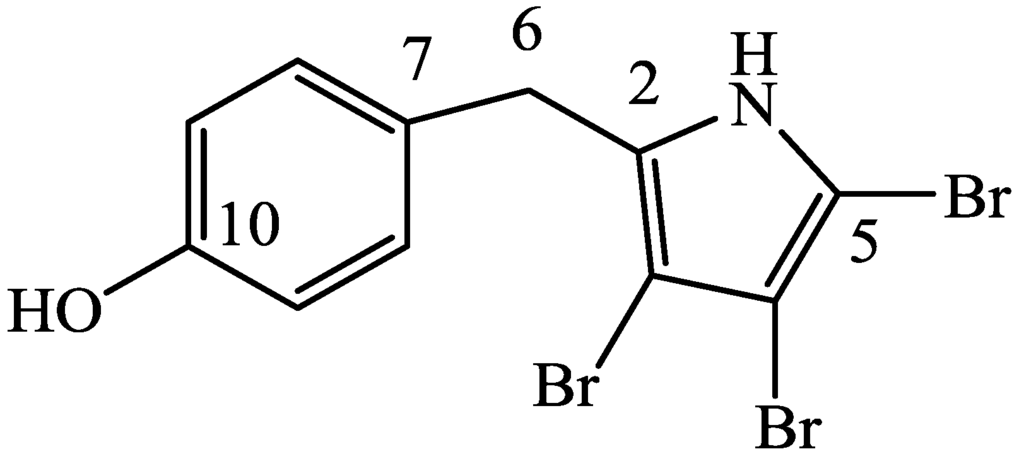 Structure of 4′-((3,4,5-tribromo-1H-pyrrol-2-yl)methyl)phenol (1).