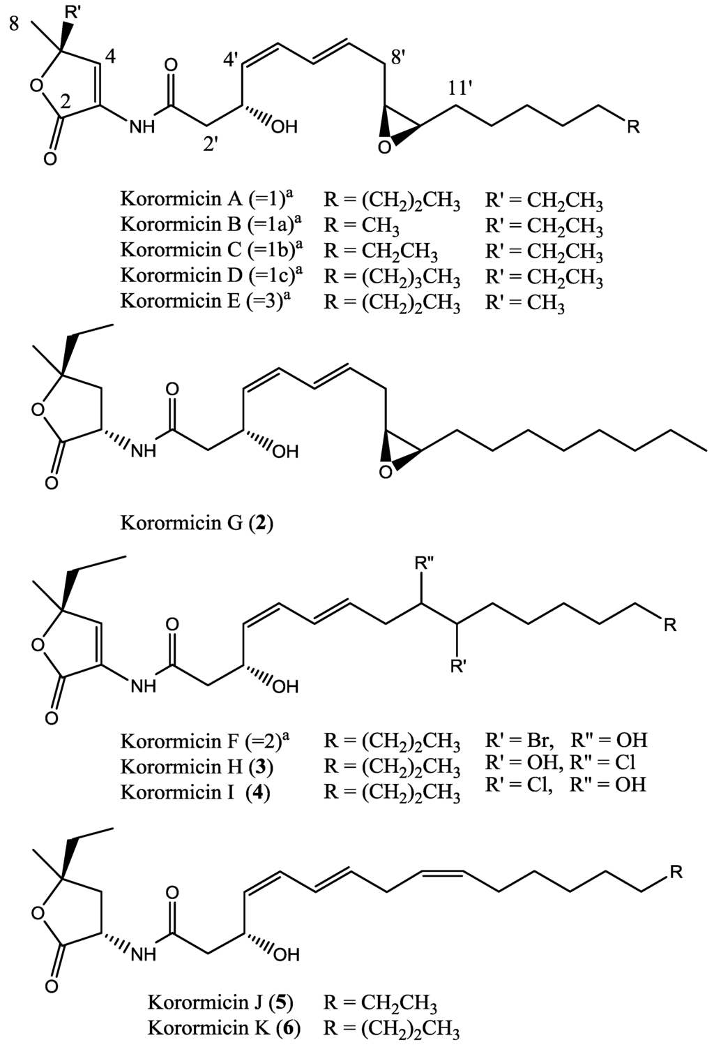 Structures of korormicins G–K (2–6). a nomenclature used by Yoshikawa et al. [].