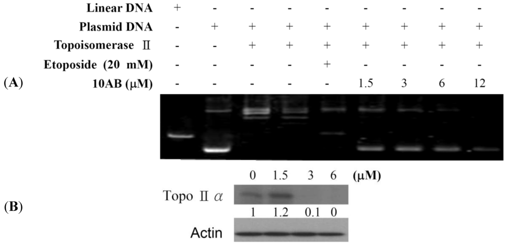 The effect of 10AB on topo IIα function. (A) The effect of 10AB on topo IIα mediated supercoiled pHOT1 plasmid DNA relaxation with cell-free system; (B) 10AB decreased the expression of topo IIα protein in HL 60 cells. HL 60 cells were treated with 10AB (0, 1.5, 3.0 and 6.0 μM) for 24 h. The protein expression of topo IIα was analyzed via Western blotting. The bands were quantified via densitometry and normalized relative to β-actin levels.