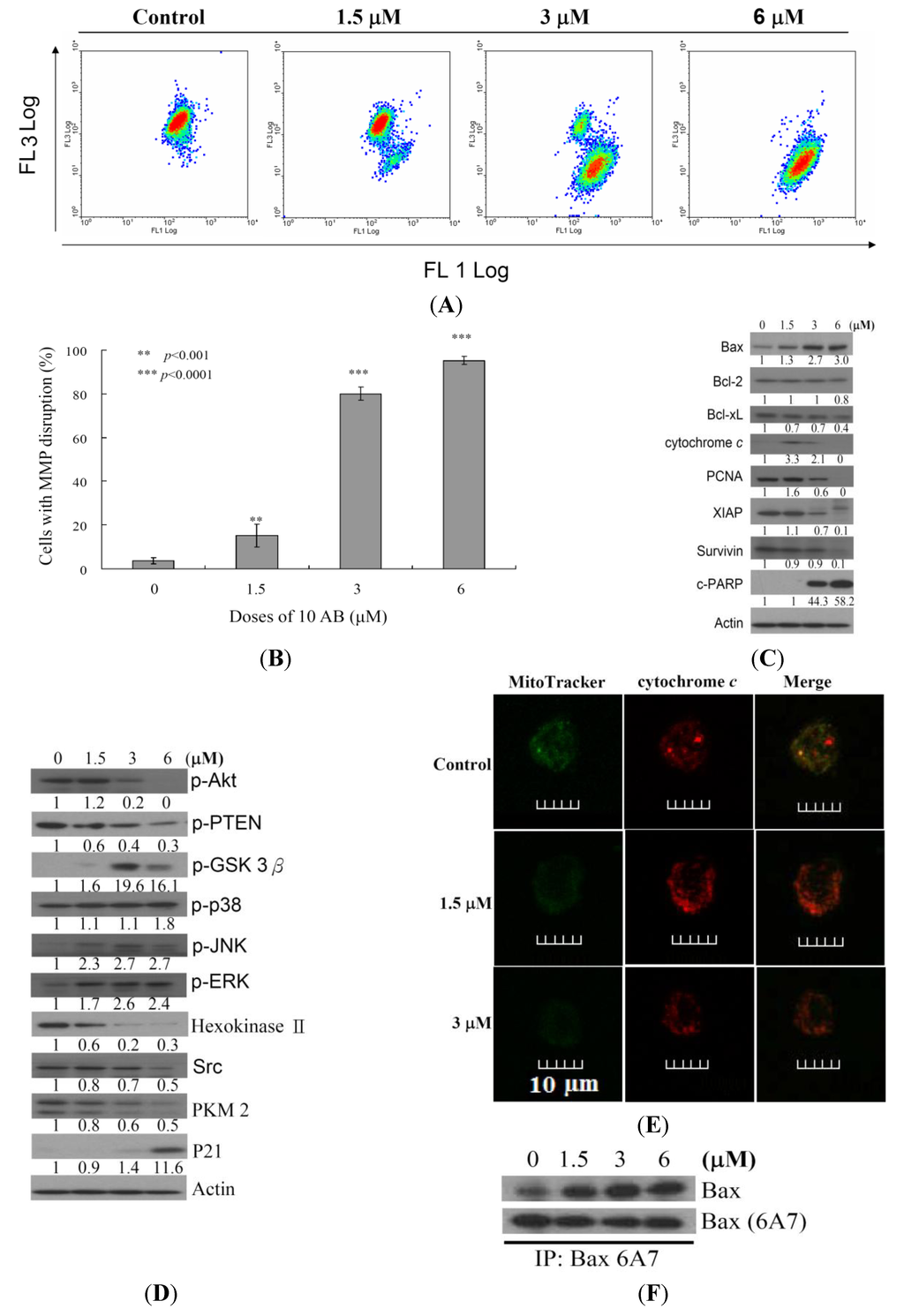 Apoptotic induction induced by 10AB involves mitochondrial dysfunction. The effect of 10AB treatment on the mitochondrial membrane potential (MMP) in HL 60 cells was evaluated. (A,B) Cells were treated with 10AB (1.5, 3.0, and 6.0 μM) for 24 h. Quantitative results showed a significant increase in HL 60 cells with disturbed MMP in response to the use of 10AB. Results are presented as means ± SD of three independent experiments (** p < 0.01; *** p < 0.001). The effect of 10AB on the expression of apoptotic; (C) and mitochondrial metabolism; (D) related proteins in HL 60 cells. The bands were quantified via densitometry and normalized to β-actin levels; (E) Merged images of Mitotracker with cytochrome c immunofluorescence suggested that the increase in cytochrome c was the direct effect of 10AB treatment at 1.5 of 3 μM; (F) Cell lysates were subjected to immunoprecipitation with anti-Bax6A7 antibody and analyzed by immunoblotting with anti-Bax antibody.