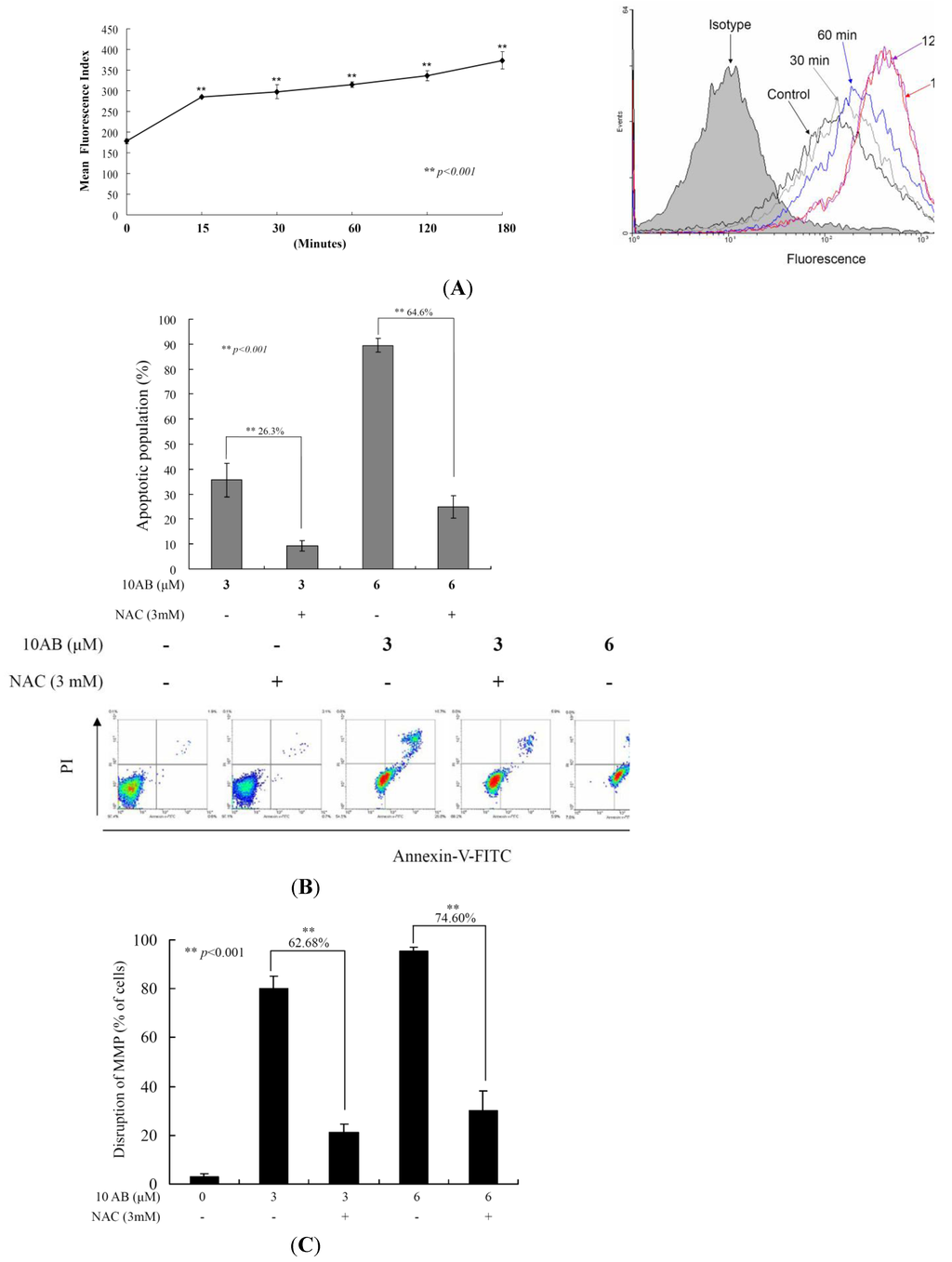 The apoptotic induction of 10AB in HL 60 cells involves ROS production. We evaluated the effect of the 10AB treatment on ROS generation in HL 60 cells. (A) Cells were treated with 10AB (6.0 μM) for the indicated times. Quantitative results showed a gradual increase in the ROS production in response to the 10AB treatment when compared with the control group. We also evaluated the effect of ROS generation on the 10AB-induced apoptosis in HL 60 cells. Cells were pretreated with 3.0 mM NAC for 2 h, then treated with 3.0 or 6.0 μM of 10AB; The apoptotic populations (B) and the disruption of MMP (C) were examined with annexin-V/PI and JC-1 staining assay. Results are presented as mean ± SD of three independent experiments (** p < 0.001).