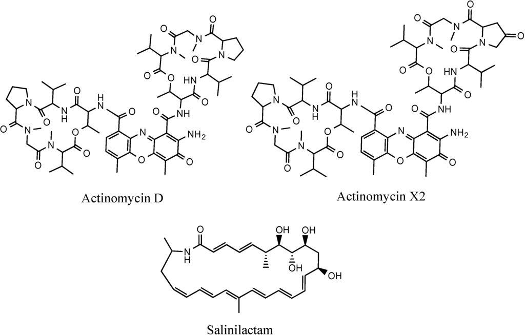Figure 1. Structures of actinomycin D, actinomycin X2 and salinilactam, isolated from strains of Streptomyces.