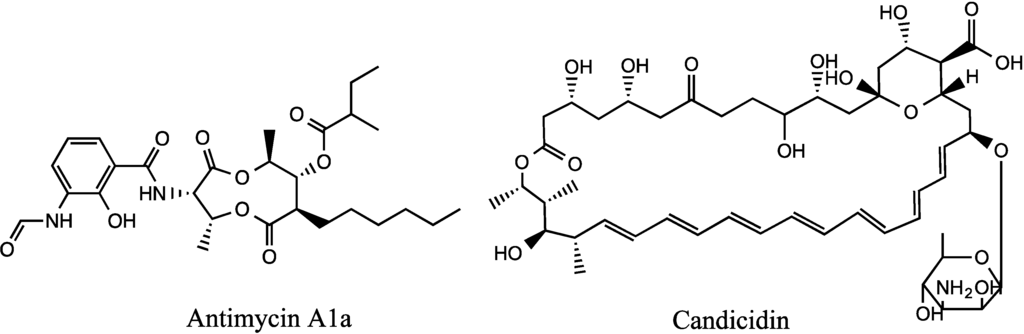 37. Neft, N.; Farley, T. Conditions influencing antimycin production by a Streptomyces species grown in chemically defined medium. Antimicrob. Agents Chemother. 1972, 1, 274–276. [Google Scholar] [CrossRef]