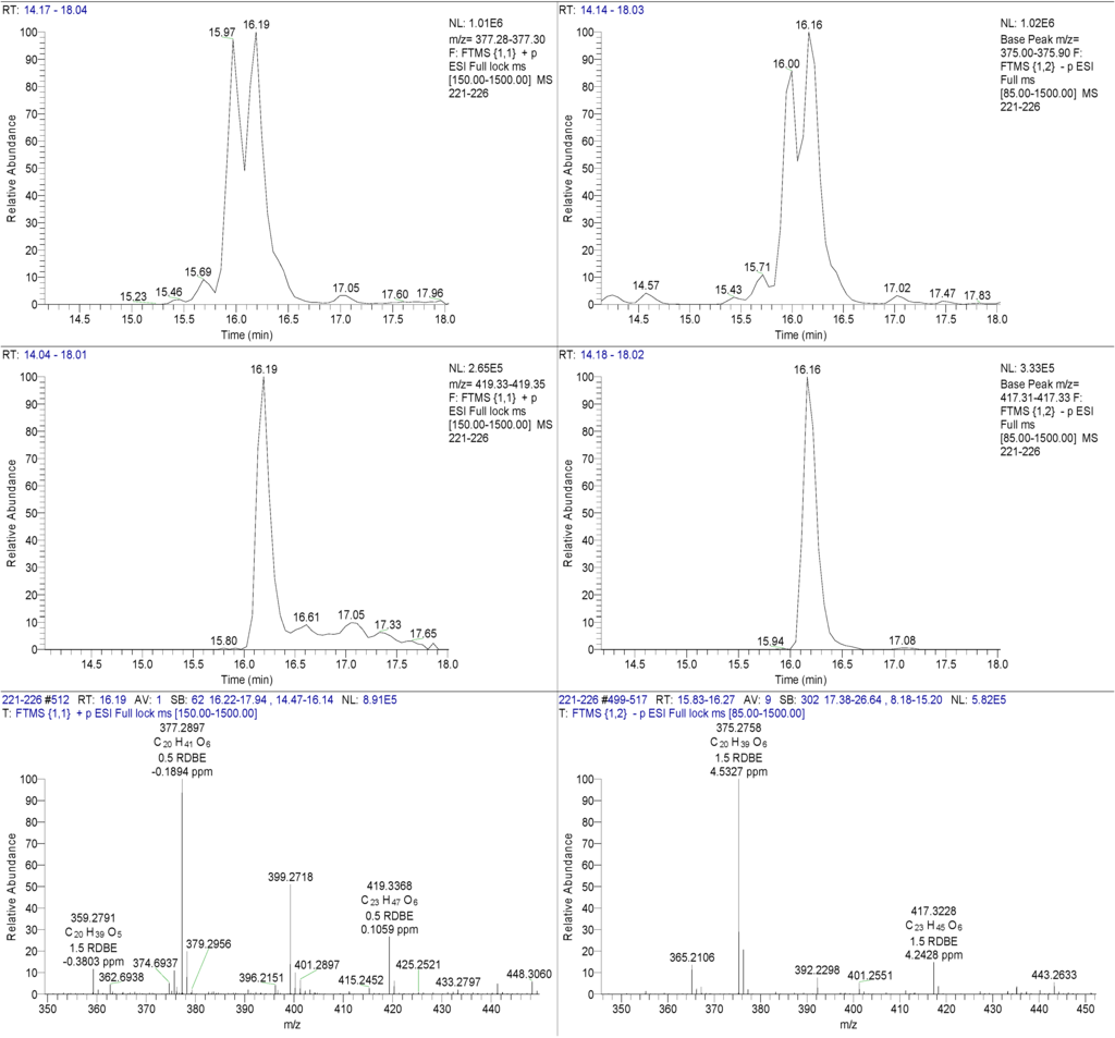 Figure 5. MSn fragmentation of the polyhydroxylated lipids found in fractions 221–230. Source fragmentation data in the positive mode summarizing the MSn ion peaks for m/z 377.2898 (red) and 419.3668 (blue).