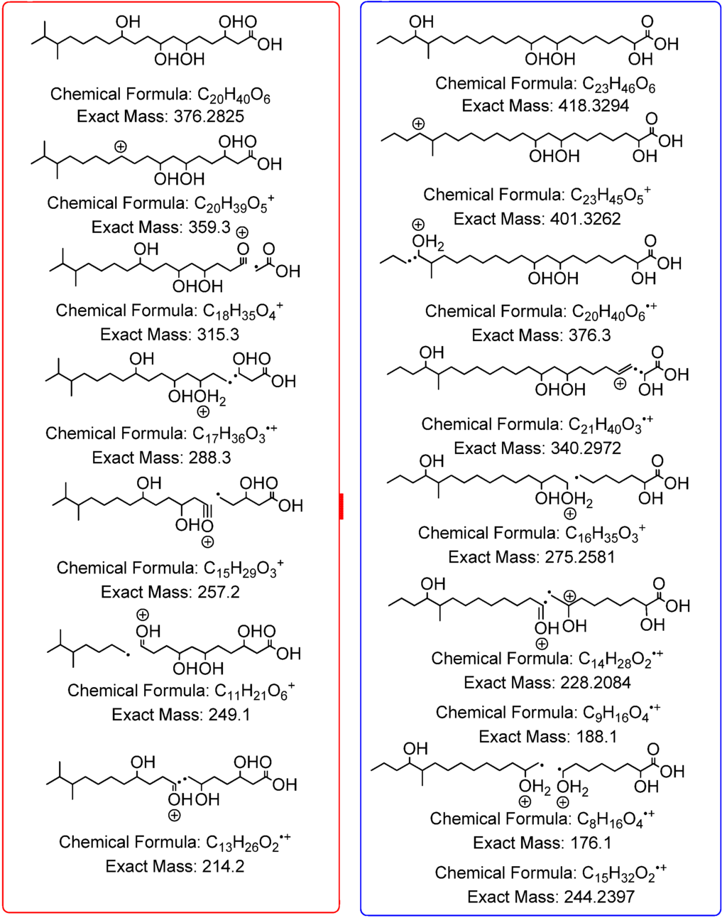 Figure 6. Proposed fragmentation pathway for 3,6,8,11-tetrahydroxy-16,17-dimethyloctadecanoic acid (C20H40O6) and 2,8,10,19-tetrahydroxy-18-methyldocosanoic acid (C23H46O6).