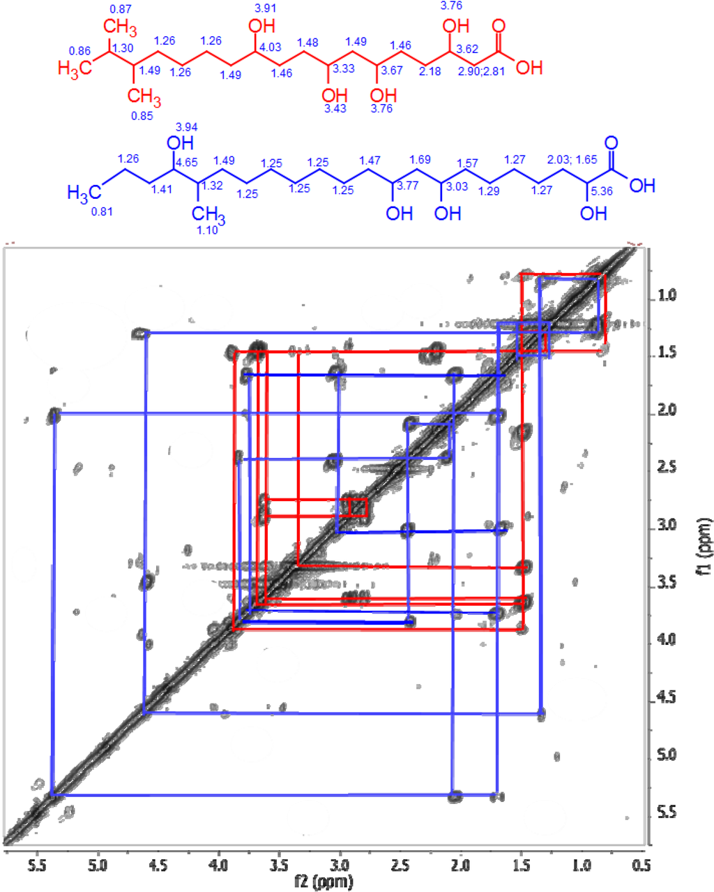 Figure 7. 1H-COSY NMR of fractions 221–226 and 227–230, which were the most potent against B. subtilis. (Full spectral data in Supplementary Information).
