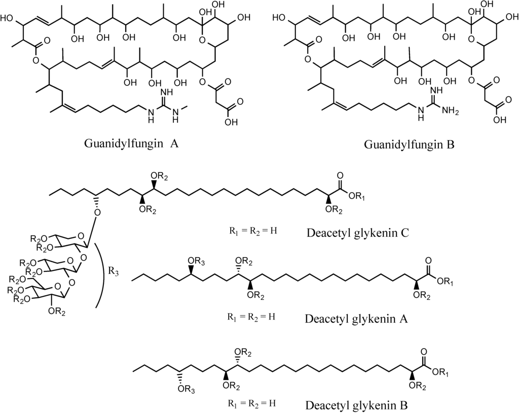 Aside from Streptomyces strain SM8, other species of Streptomyces such as S. scabies primarily produce saturated fatty acids rather than unsaturated fatty acids [23]. Hydroxy saturated fatty acids have previously been reported to have activity against some strains of fungi [24], whereas other saturated fatty acids have been proven to inhibit the growth of methicillin-resistant Staphylococcus aureus [25]. Polyhydroxy saturated fatty acids have previously been isolated from fungi such as Ulocladium botrytis and Haematomma ventosum [26,27]. They have also been found as degradation products of guanidylfungin A and B (Figure 8), metabolites of S. hygroscopicus that are active against fungi and Gram-negative bacteria [28,29]. The tetrahydroxy saturated fatty acids also comprise the aglycone portion of the deacetyl glykenins A–C (Figure 8) which are glycosidic antibiotics produced by Basidiomycetes sp. [22].