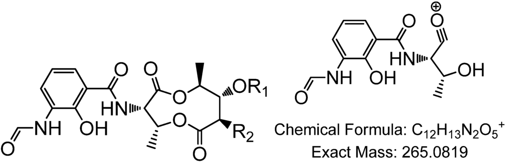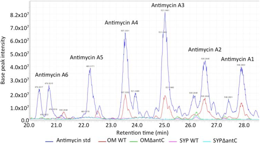 The active fractions were also analyzed by LC-Orbitrap and based on accurate mass (±3 ppm), we searched the Dictionary of Natural Products (DNP) database to putatively identify metabolites that had previously been reported as products of Streptomyces sp. As seen in Table 3, the predominant identified compounds were members of the antimycin family.