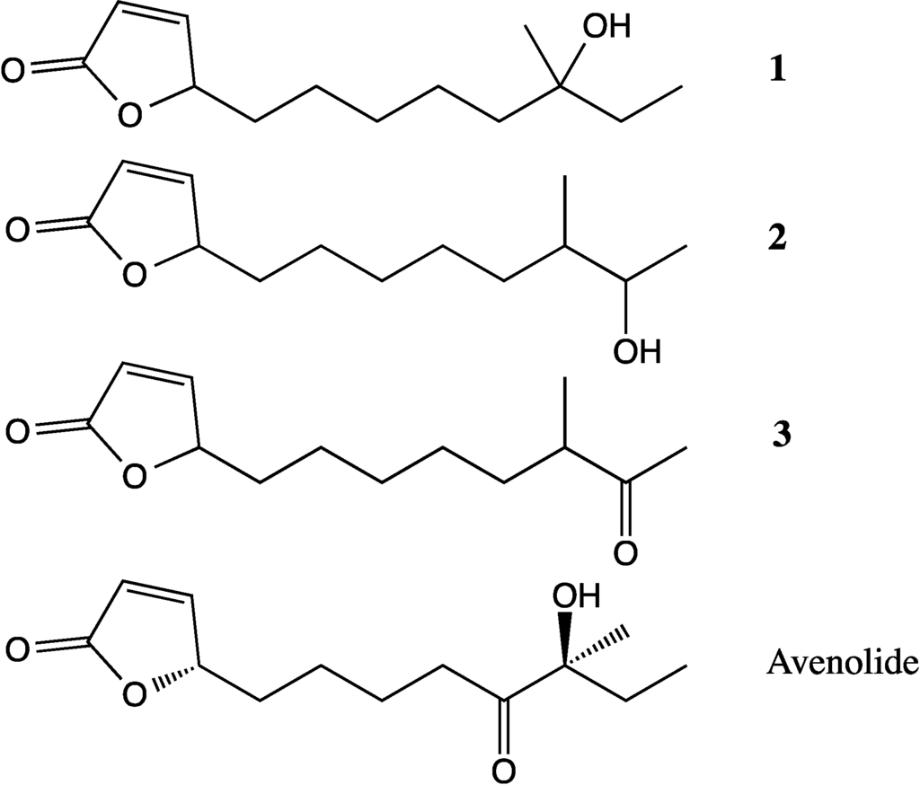 4,10-Dihydroxy-10-methyl-dodec-2-en-1,4-olide (1): Rf 0.56 (80:20 MeOH:H2O, C-18 silica gel), blue-violet with anisaldehyde-sulfuric acid; UVmax 219.0 (MeOH); 1H NMR (400 MHz, DMSO) δ 7.84 (1 H, dd, J = 5.7, 1.4 Hz, H-3), 6.20 (1 H, dd, J = 5.7, 1.8 Hz, H-2), 5.15 (1 H, m, H-4), 1.71 (1 H, m, H-5a), 1.55 (1 H, dd, J = 14.3, 6.9 Hz, H-5b), 1.33 (2 H, q, J = 7.5 Hz, H2-11), 1.33 (2 H, H2-6), 1.28 (brd. s), 0.98 (3 H, s, CH3-13), 0.79 (3 H, t, J = 7.5 Hz, CH3-12); 13C NMR (100 MHz, DMSO) δ 173.6 (1-C=O), 159.3 (3-CH), 120.8 (2-CH), 83.7 (4-CH), 71.2 (10-C), 41.5 (9-CH2), 34.4 (5-CH2), 34.4 (11-CH2), 30.1 (7-CH2), 26.9 (13-CH3), 25.0 (6-CH2), 23.8 (8-CH2), 8.8 (12-CH3); HRESIMS: Calculated: m/z 227.1602 [M + H]+; Experimental: m/z 227.1637 [M + H]+.