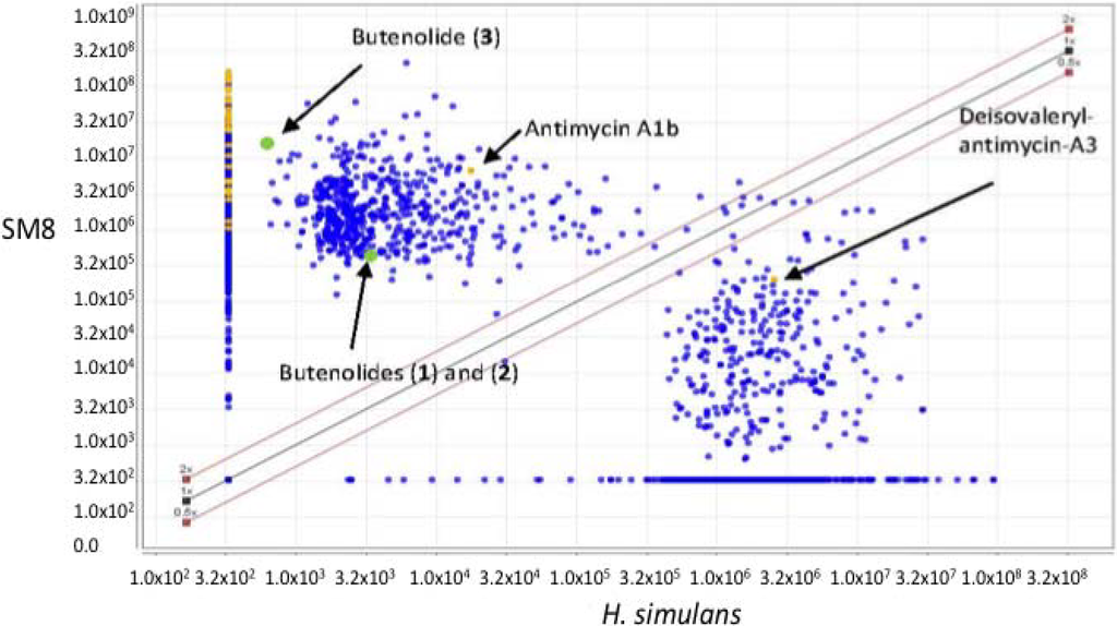 Comparison of the extracts of the host sponge H. simulans and its endosymbiont, Streptomyces SM8, using high resolution LC-MS revealed the presence of metabolites, including antimycins and a putative candicidin shunt or degradation product common to both extracts. This confirmed that SM8 is indeed associated with H. simulans and that bioactive components produced by Streptomyces SM8 are present in the sponge tissue, thus providing further evidence of the potential for microbial symbionts to provide their sponge host with a chemical defense system.