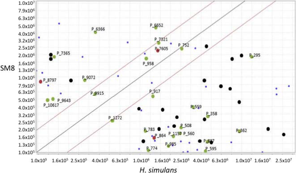 An acetone-methanol extract of H. simulans was de-salted with gradient elution through HP20 using water and methanol followed by 50:50 acetone:methanol and 100% methanol washes. An aliquot was taken from each fraction aside from the 100% water and the 90:10 aliquots, which contained the most salt. The pooled aliquot was dried down and resuspended in 10:90 H2O:MeOH to a final concentration of 1 mg·mL−1 for LC-MS. The SM8 sample was taken from the larger-scale extract and was dissolved in methanol. The samples were run on an Accela HPLC system coupled to a Thermo Scientific Exactive-Orbitrap using the same column and method stated in section 3.5.2. The results were compared using MZmine 2.10 [49].