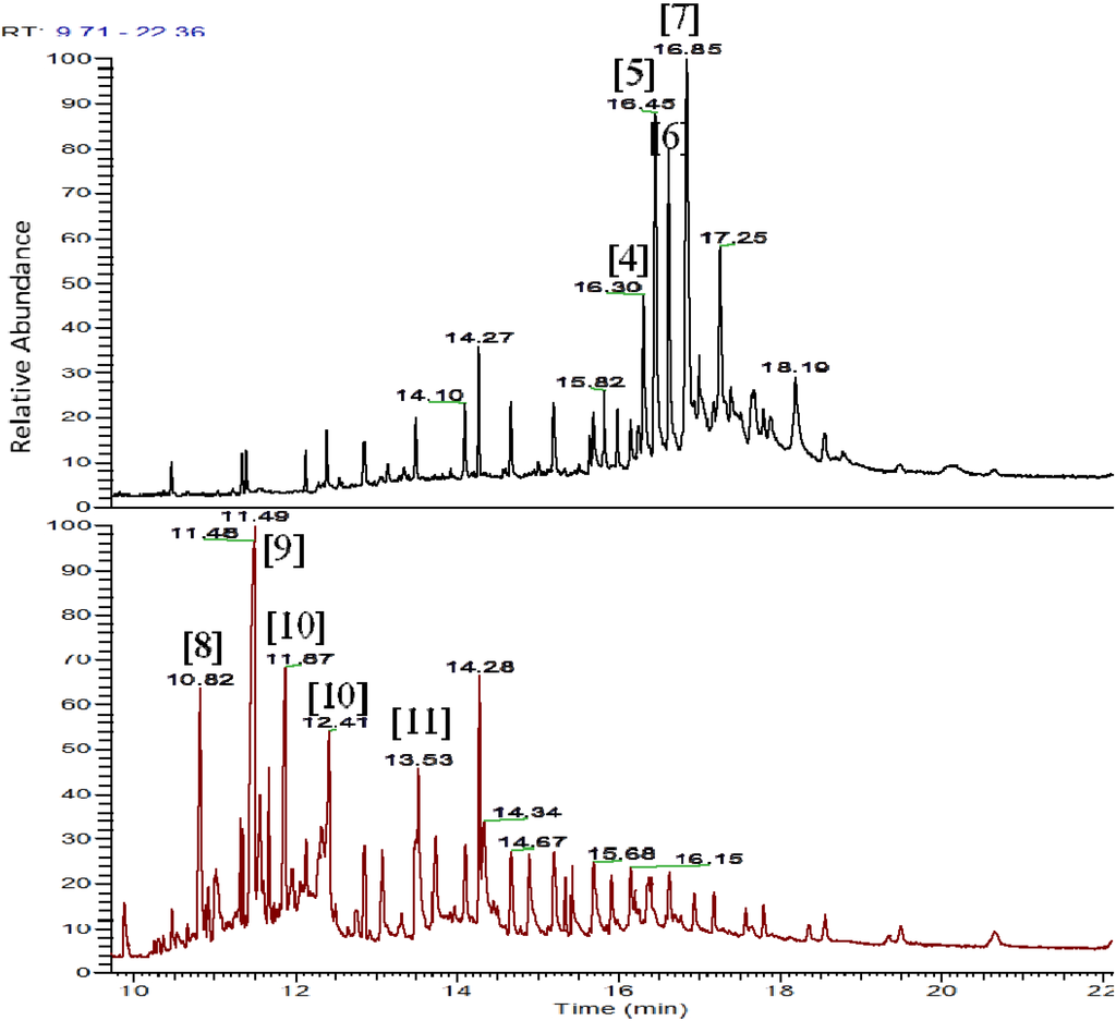 The ethyl acetate-soluble portions of the extracts of H. simulans and SM8 were run on a Focus GC-DSQ II from Thermo Scientific (Thermo Fisher Scientific (Bremen) GmbH, Bremen, Germany). The column, InertCap 1MS (ID: 0.25 mm, length: 30 m, df: 0.25 μm) was from GL Sciences Inc., Tokyo, Japan. The oven temperature was set at 80 °C for 1 min after which the temperature was increased at a rate of 15° min−1 until 200 °C. This temperature was maintained for 15 min after which it was again increased at a rate of 5° min−1 until the final temperature of 320 °C. This was held for 10 min until the end of the run. The base temperature of the SSL was 250 °C whereas the MS transfer line was maintained at 320 °C. The electron ionization (EI) source temperature of the DSQ II mass spectrometer was set to 250 °C. The injection was performed in the splitless mode with helium as the constant carrier gas at a flow rate of 1.5 mL·min−1 and mass scan range at m/z 50.0–800.0.