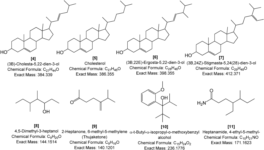 53. Thompson, R.H.; Patterson, G.W.; Thompson, M.; Slover, H.T. Separation of pairs of C-24 epimeric sterols by glass capillary gas liquid chromatography. Lipids 1981, 16, 694–699. [Google Scholar] [CrossRef]