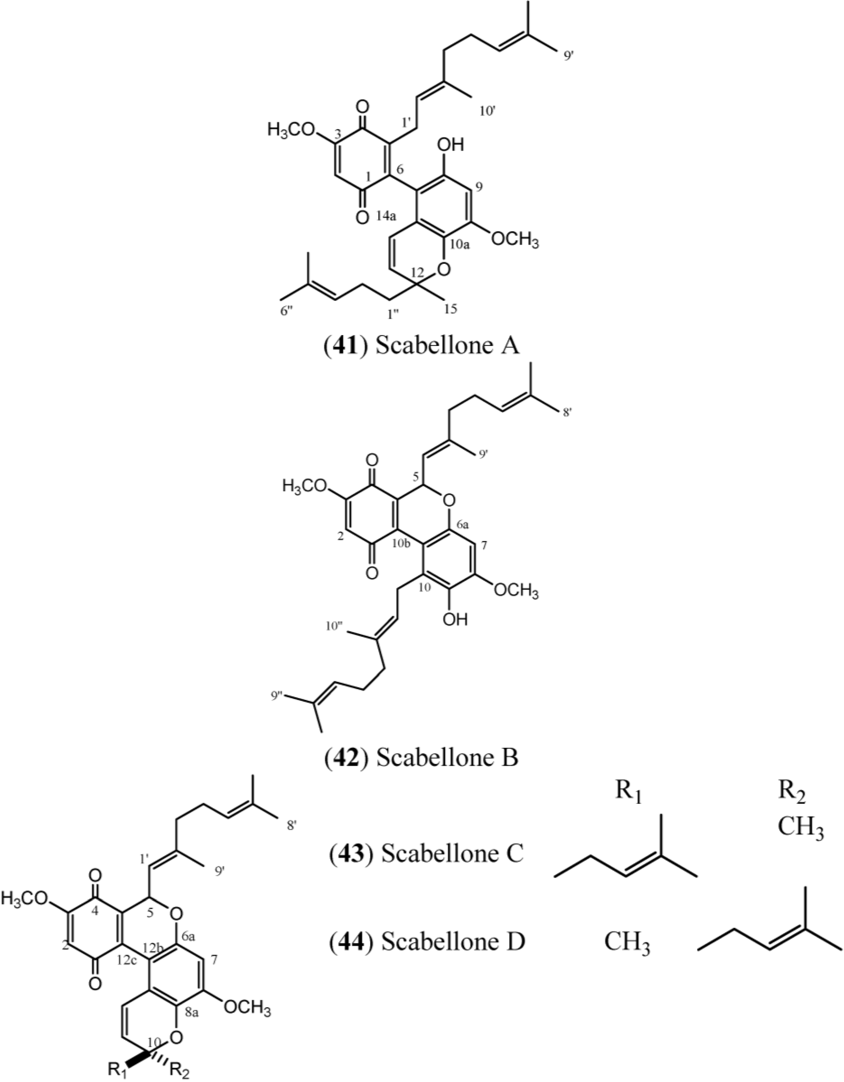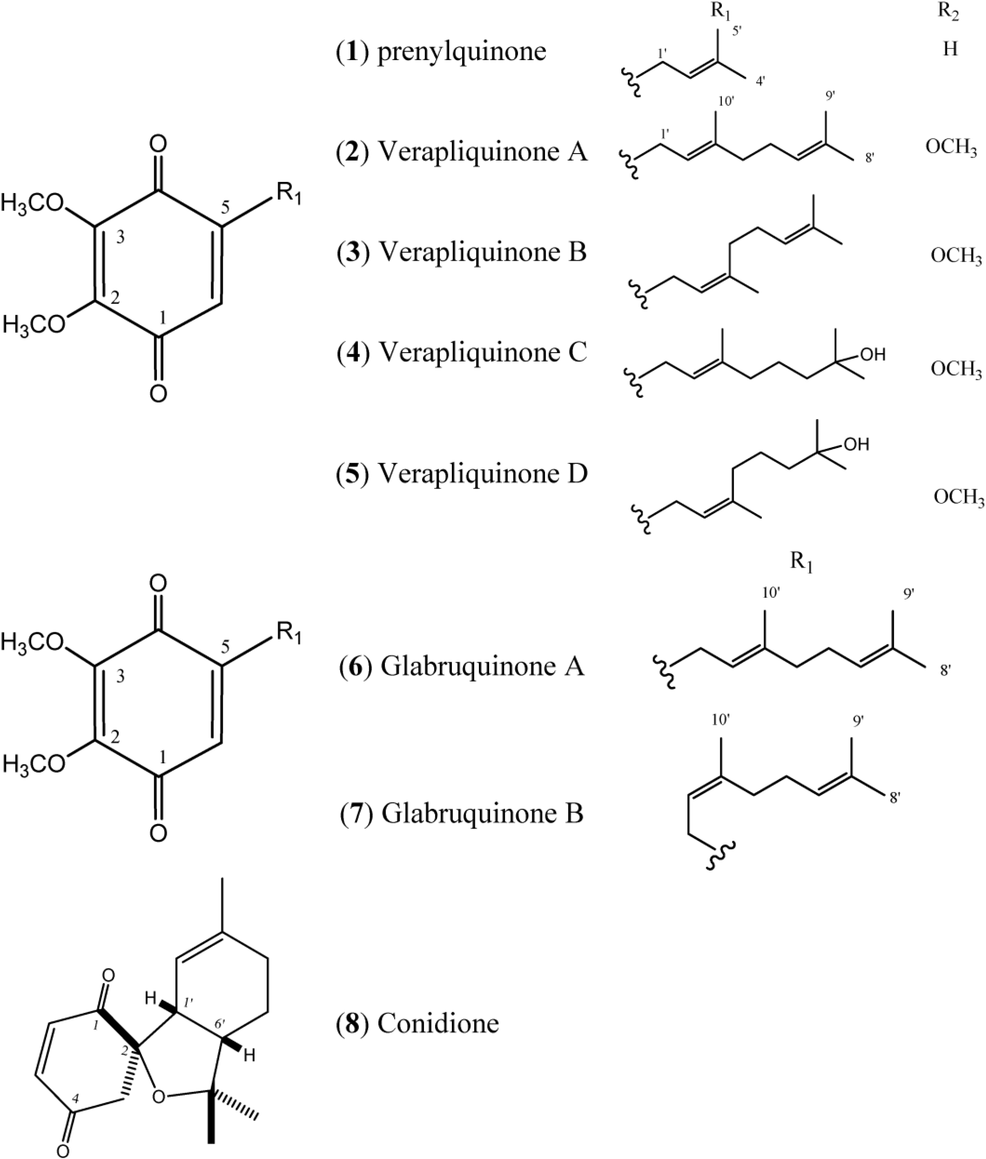 12]. Although, there are examples of metabolites that contains nitrogen in the prenylated quinone moiety, such as conicaquinone A, which has an unusual 1,1-dioxo-1,4-thiazine ring added to the quinone moiety. These meroterpenes are the focus of the current review, which describes the structures, biological activities and