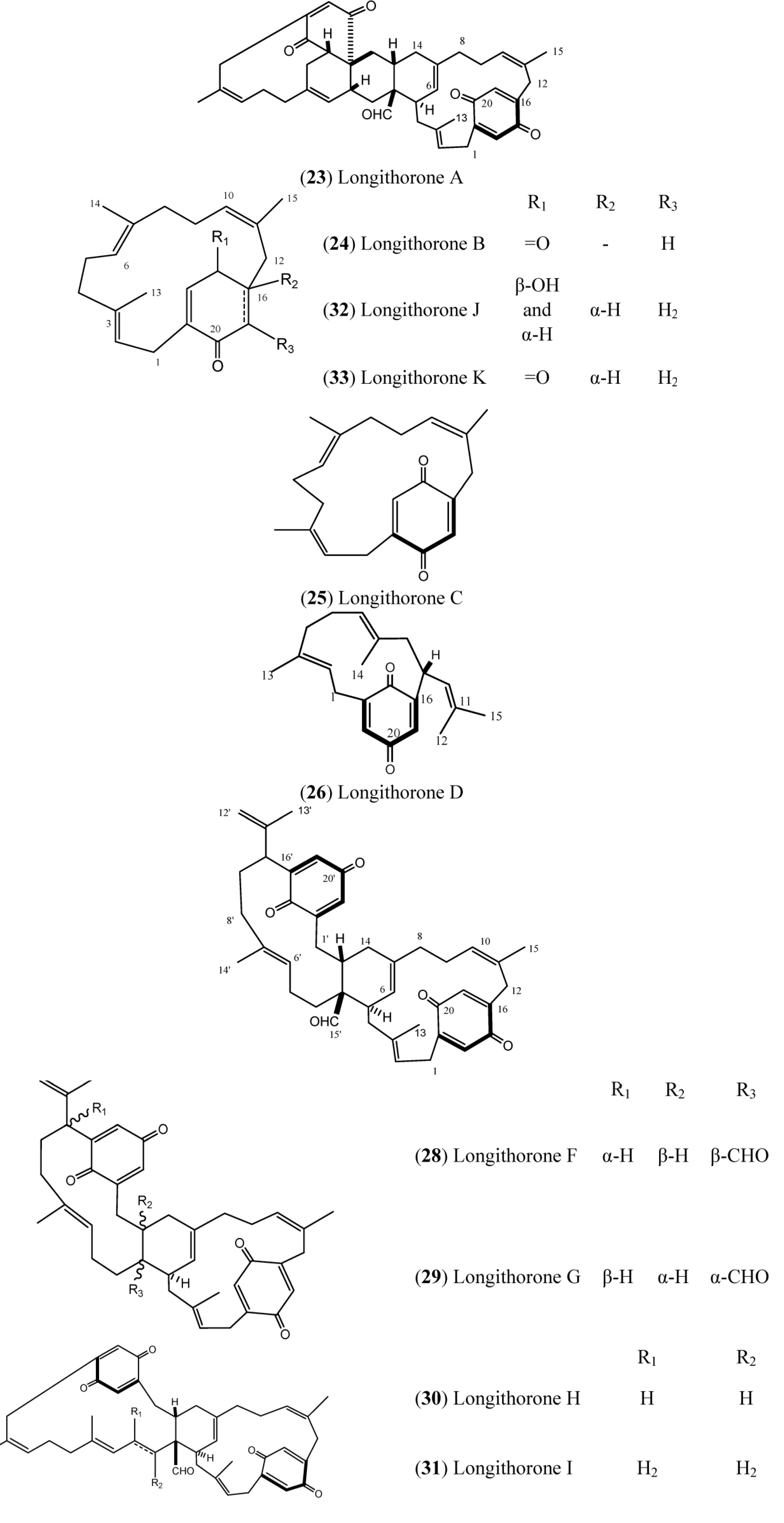 34), which replace the methylene group corresponding to C-1 in longithorones [
