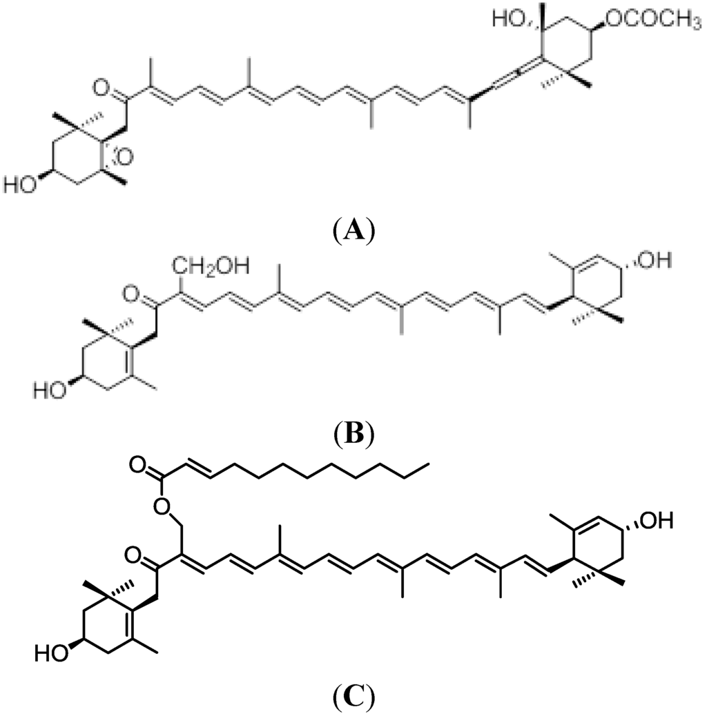 Structures of fucoxanthin (A); siphonaxanthin (B) and siphonein (C).