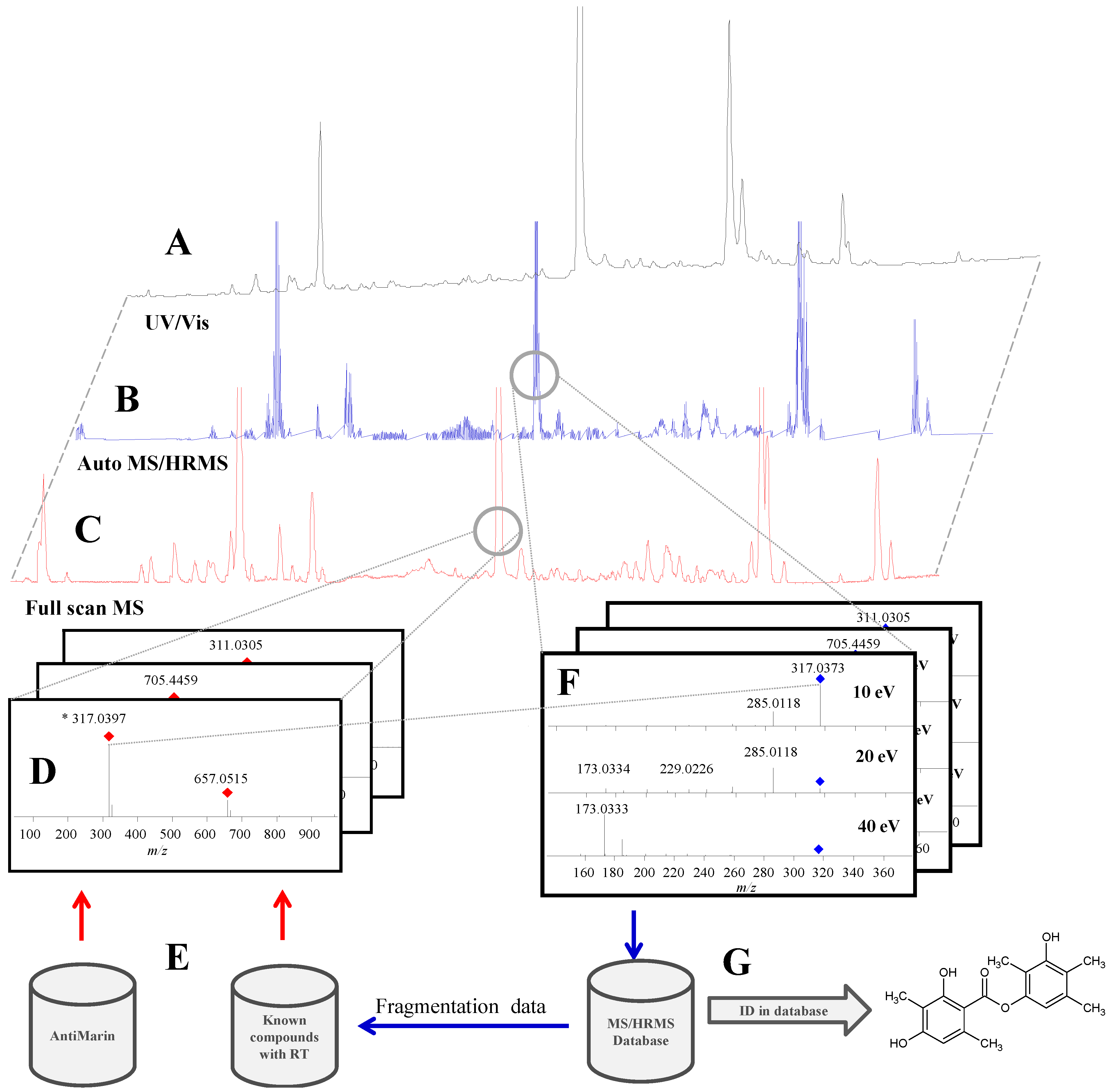 Ultra-high performance liquid chromatography-diode array detection-quadrupole time of flight mass spectrometry (UHPLC-DAD-HRMS) with auto- tandem high resolution mass spectrometry (MS/HRMS) analysis was used to screen the extracts and subsequently, MS/HRMS data was matched against a newly constructed library of 1300 compounds (10, 20, and 40 eV spectra) using the Agilent search algorithm. This algorithm is an integral part of the Agilent MassHunter software, which can subtract background and merge spectra over a chromatographic peak into a single spectrum prior to automatic search against the library. To assess the limitations and inherent bias of the library, we compare the results with the aggressive dereplication approach [20] based on accurate mass, isotope pattern, and lists of taxonomically relevant compounds. Specificity is tested on a number of small polar analytes, showing the importance of including retention time and appropriate search parameters for compounds with less characteristic spectra. Finally, comparison with UV/Vis detection was done for a number of poorly ionizing compounds showing the value of this additional cheap detector.