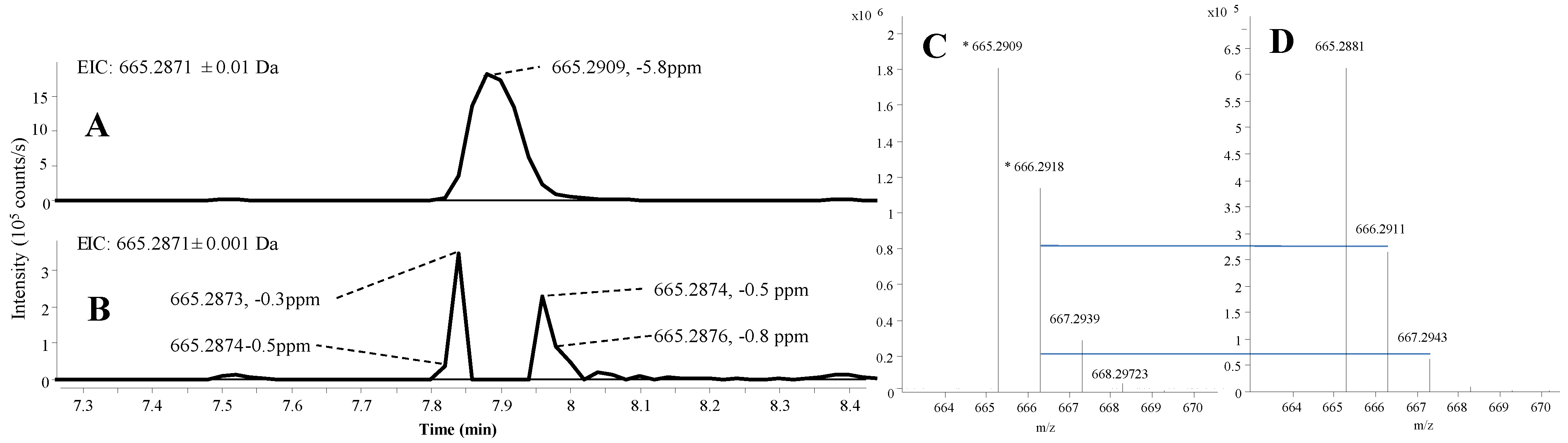 Ultra high performance liquid chromatography-electrospray ionization extracted ion chromatograms (UHPLC-ESI+ EIC) of asperazine [M + H]+ in an extract from Aspergillus tubingensis, showing the excellent mass accuracy until saturation in the peak apex. (A) EIC at ±0.01 Da; (B) EIC at ±0.001 Da; (C) spectrum at peak apex; and (D) spectrum at a non-saturated part of the peak. The vertical lines between C and D indicate the theoretical isotopic abundance of the A + 1 and A + 2 isotopomers.