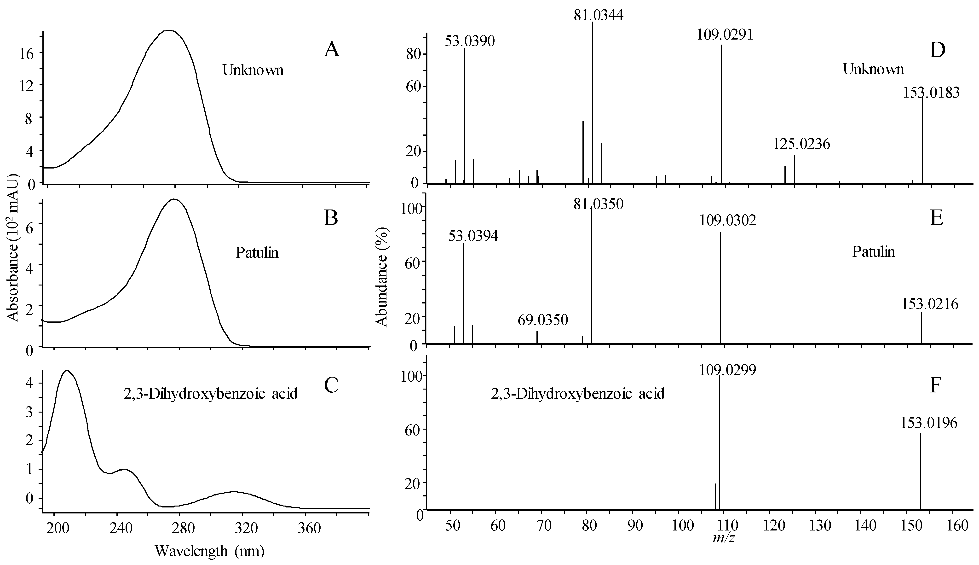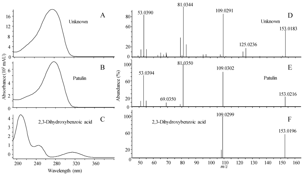 UV/Vis spectrum (A) and MS/HRMS spectrum at 10 eV (ESI−); (D) of unknown peak identified as patulin, compared to the patulin reference standard (B,E); and 2,3-dihydroxybenzoic acid (C,F). Identity was confirmed by correct retention time.