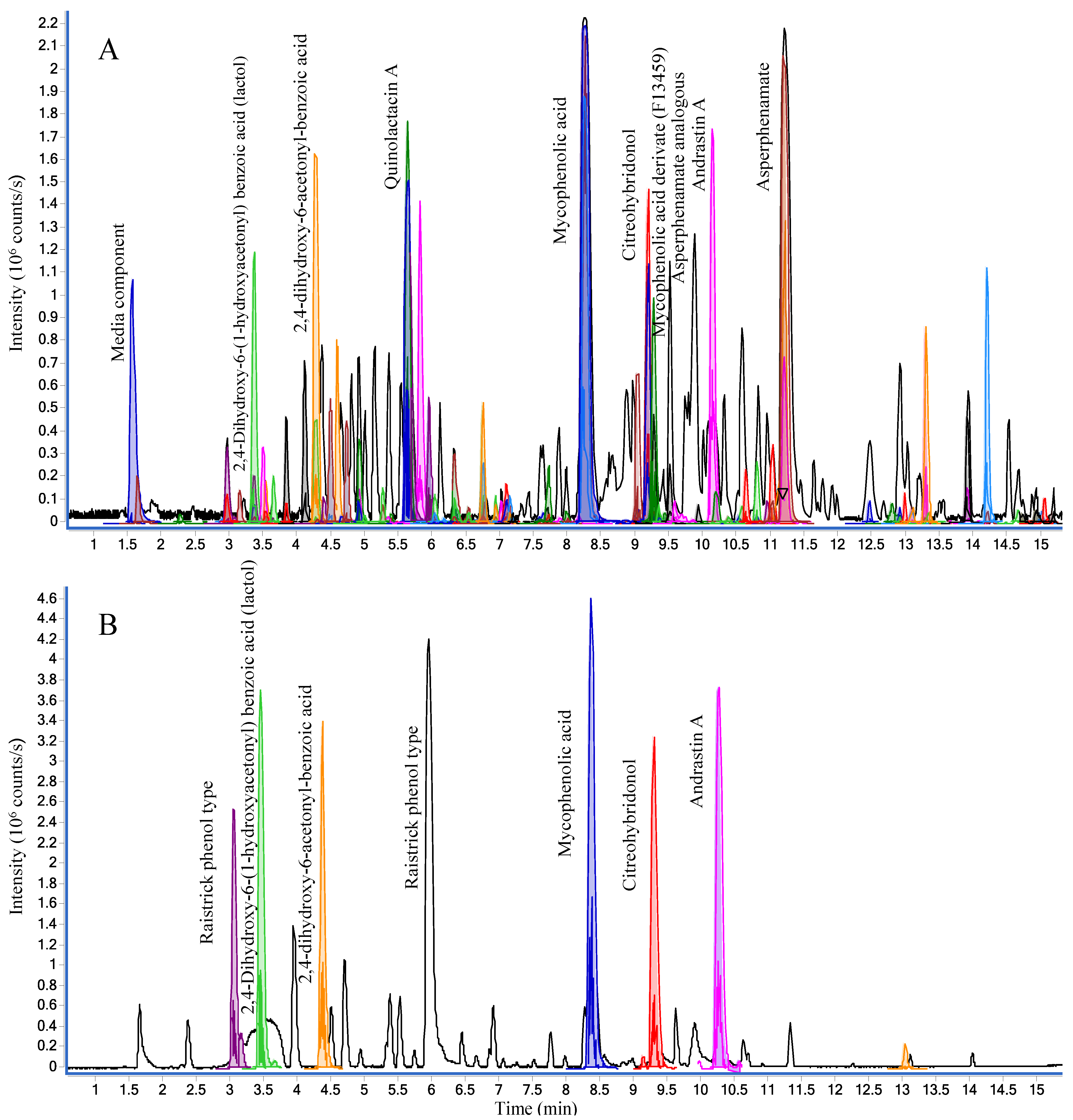 The aggressive dereplication approach also identified fellutamides and breviones which are expected from the species [55]; this could, however, not be supported by the MS/HRMS. Most false positive results originated from fragments or adducts of other compounds in the extract. Examples of these were: (i) the loss of acetate from the andrastin A in ESI+ matching andibenin B; (ii) quinolactacin A producing [2M + Na]+ and [2M + H]+ ions matching the [M + Na]+ and [M + H]+ of fellutanine D, respectively. Close inspection of adduct pattern and retention times, however, showed that andibenin B and fellutanine D were false positives. This underlines the importance of the MS/HRMS dimension for improved confidence in dereplication. False positives are eliminated and compounds that are missed because they are not part of the library can still be verified based on the MS/HRMS data. The unbiased minimum free energy (MFE) algorithm did, as expected, find many more peaks (50%–100%) than the two targeted approaches (data not shown); however, all major peaks in the chromatograms were detected by the targeted approaches, and all major biological activities could be accounted for by compounds in the MS/HRMS library.
