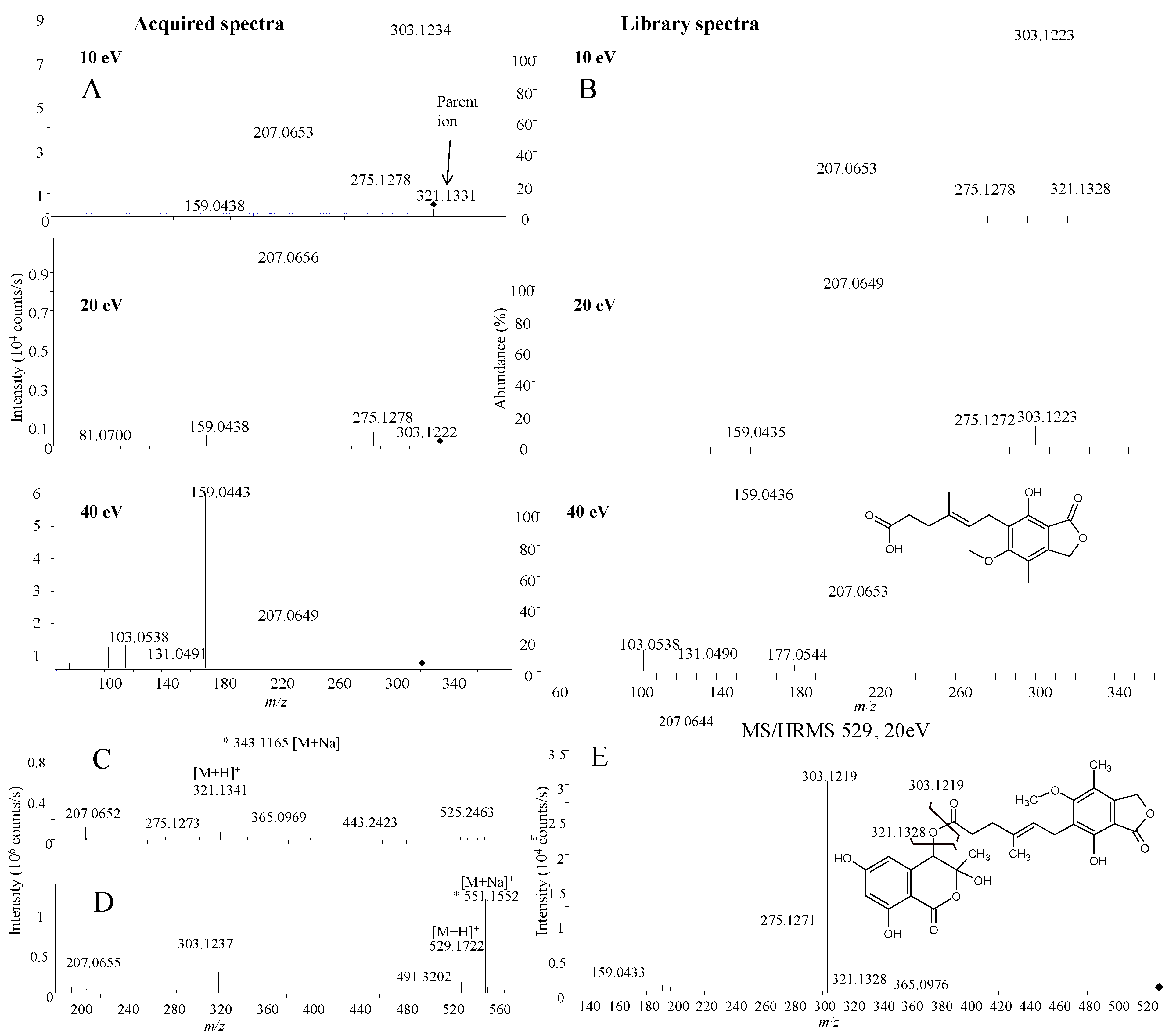 The active fractions were found to contain mycophenolic acid (Figure 4 and Figure 5), which is the active compound in the prodrug CellCept® (Mycophenalate mofetil) used as immunosuppressant in transplant medicine [56]. Several other activities have been reported including antiviral, antitumor [57], and CNS [56,58], in line with the activity observed in this study. The extracted MS/HRMS spectra (Figure 5A) in ESI+ were compared to the mycophenolic acid standard in the MS/HRMS library (Figure 5B) with high scores (>90%) using both reverse and forward searching based on the accuracy of the parent ion (−0.31 ppm for [M + H]+ 321.1328) and specific and abundant fragment ions at m/z 207.0649 [C11H11O4]+ and 159.0436 [C10H7O2]+.