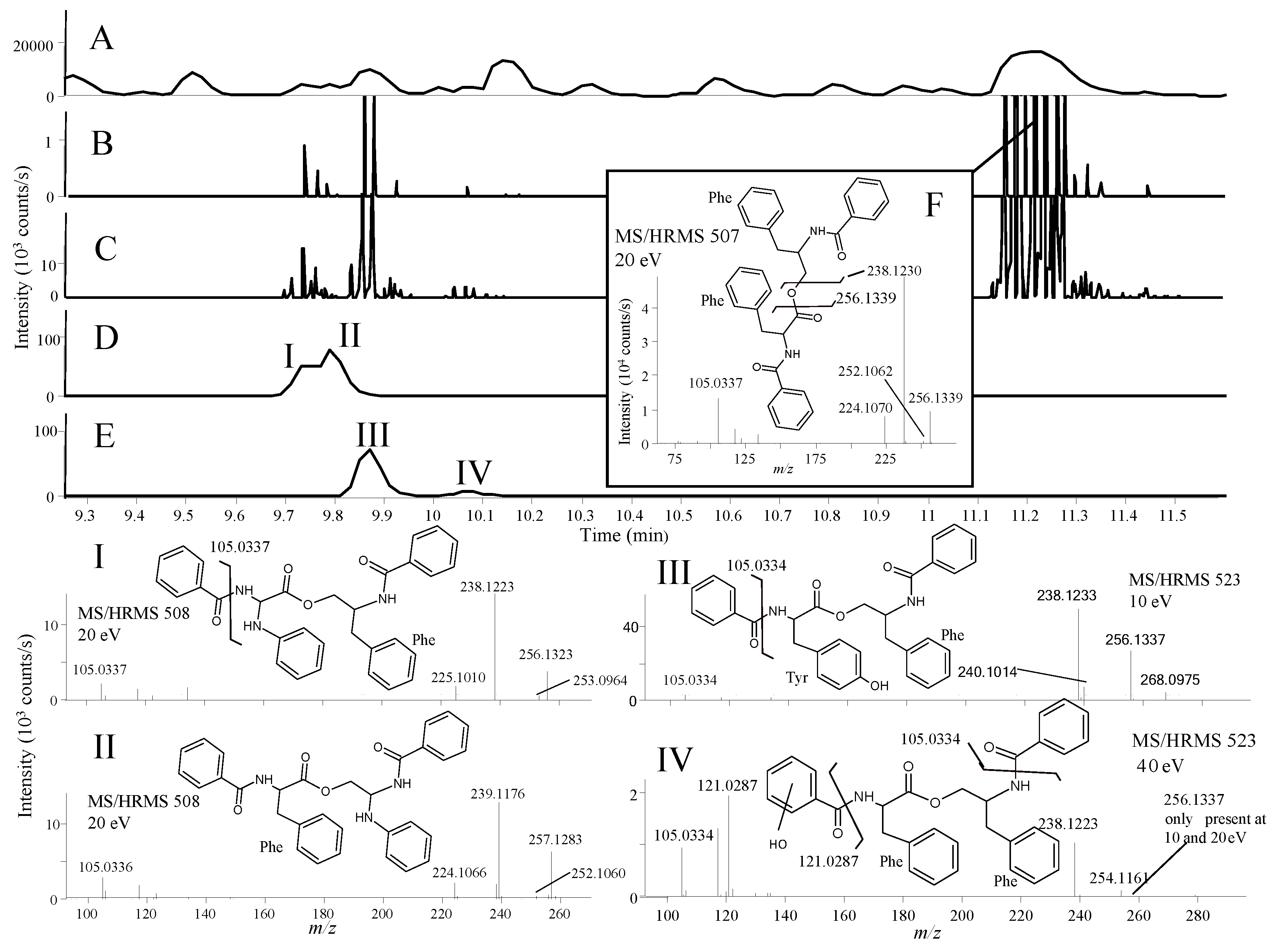 In the fraction displaying anticancer activity (unpublished assay), the library analysis led to the tentative identification of the fungal anticancer metabolite, asperphenamate (Figure 6F) [61]. A group of peaks eluting close to asperphenamate shared their major fragment ions as found using similarity searching (parent ion not used), which showed the presence of four novel asperphenamate analogues with the tentative structures I to IV (Figure 6). Unambiguous structure verification of course requires isolation and elucidation using nuclear magnetic resonance (NMR) spectroscopy.