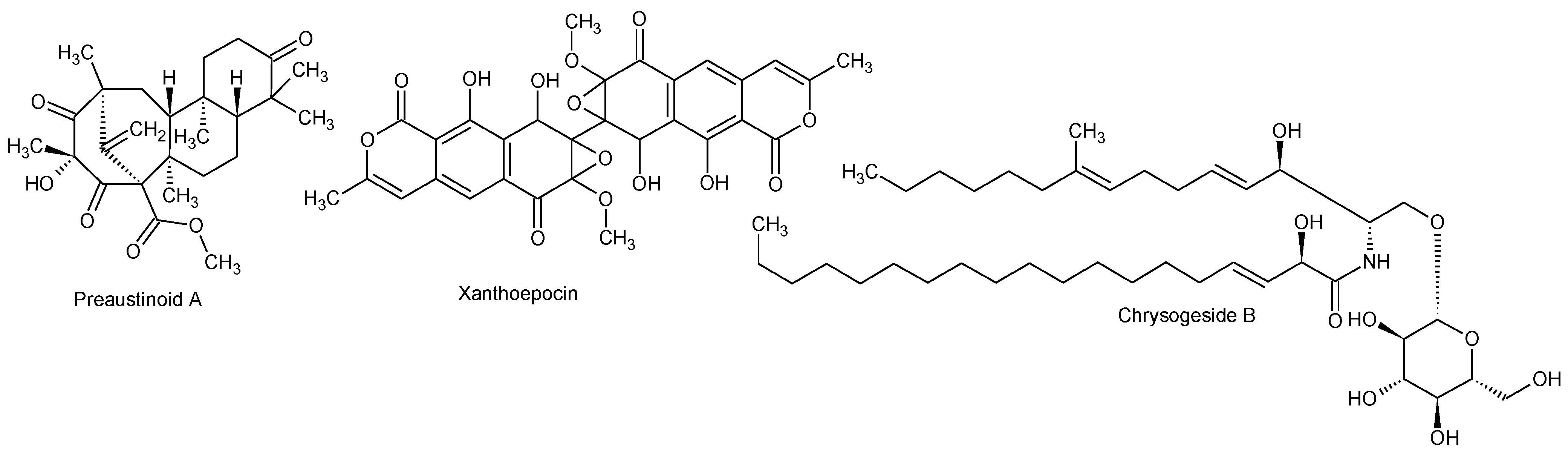 - Ando, T.; Igarashi, Y.; Kuwamori, Y.; Takagi, K.; Ando, T.; Fudou, R.; Furumai, T.; Oki, T. Xanthoepocin, a new antibiotic fom Penicillium simplicissimum IFO5762. J. Antibiot. 2000, 53, 928–933. [Google Scholar] [CrossRef]