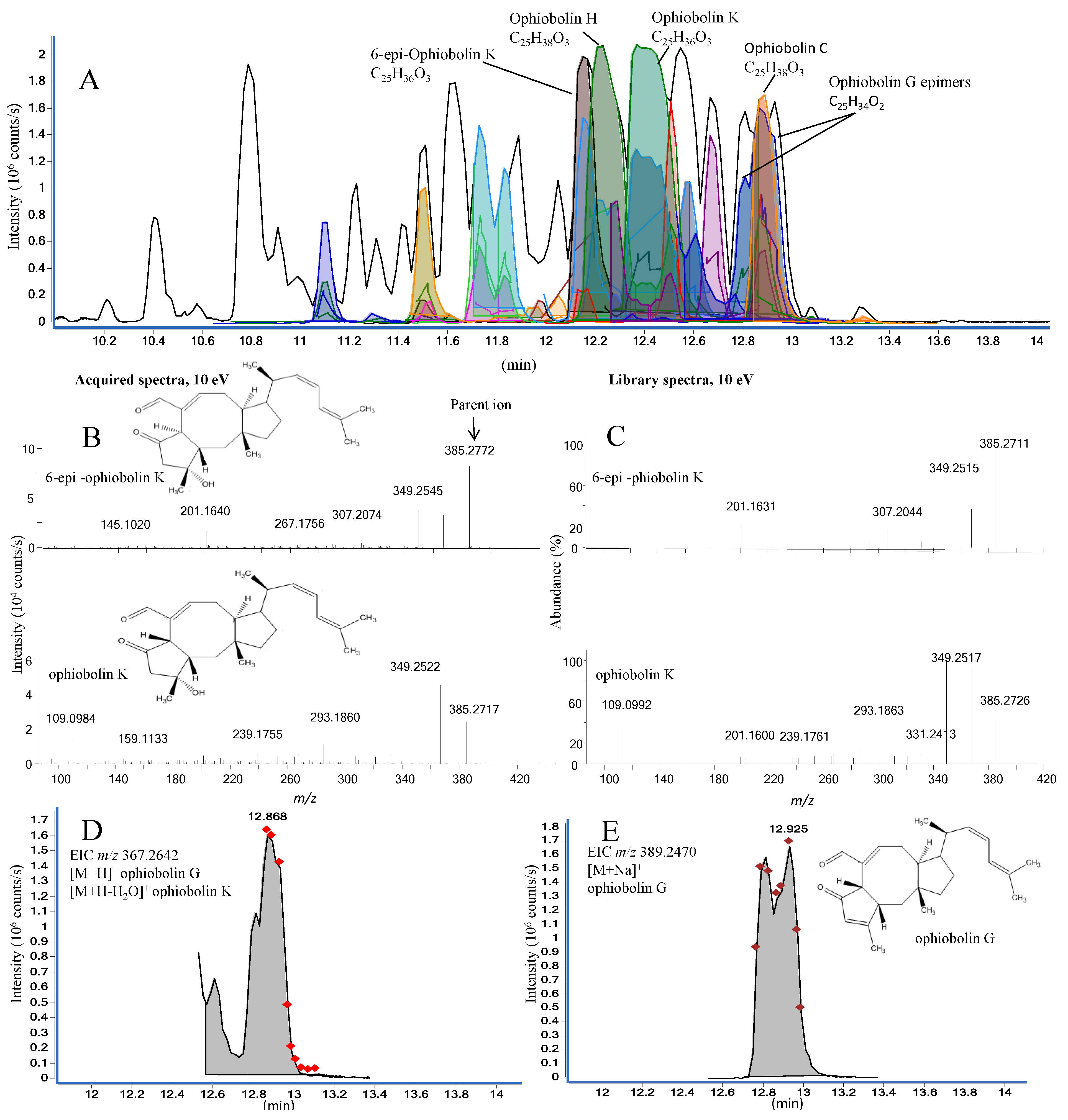 (A) Active fraction enriched with compounds from the ophiobolin family in positive ESI mode. More than one color shading of the same peak is either due to different EIC and ECC for same match but different adducts or for other matches that had scored less; (B) MS/HRMS acquired spectra (10 eV) for library match of 6-epi-ophiobolin K and ophiobolin K; (C) MS/HRMS library spectra (10 eV) of 6-epi-ophiobolin K and ophiobolin K; (D) The EIC for the parent m/z 367.2642 with ophiobolin K as the best library match; (E) The EIC for the parent m/z 389.2470 with ophiobolin G as the library match. The diamond markers indicate number of scans across the peak.