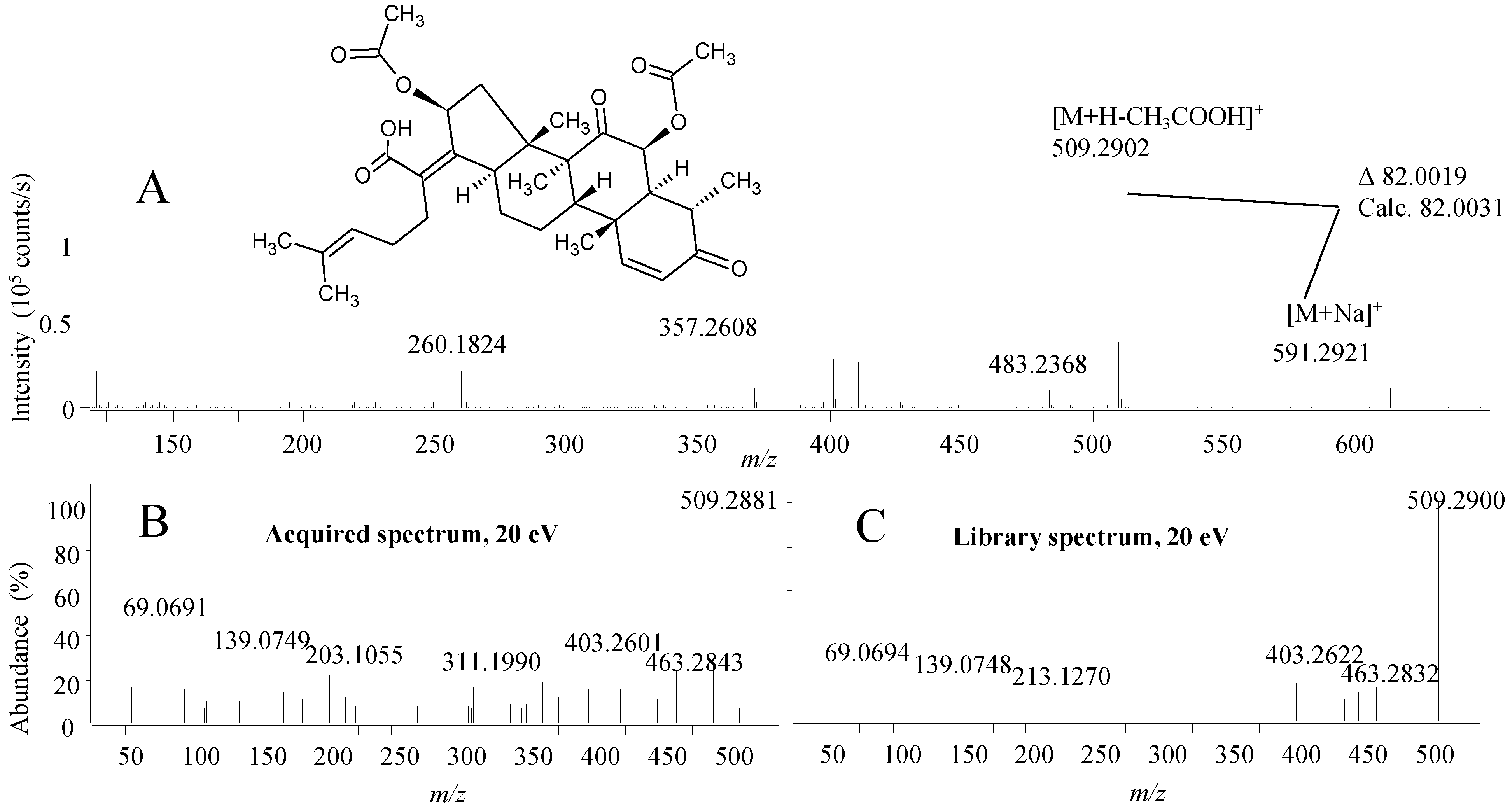 (A) The structure of helvolic acid and the ESI+ MS spectrum; (B) MS/HRMS spectrum at 20 eV from ESI+ of helvolic acid and (C) the corresponding library spectrum (parent ion m/z 509).