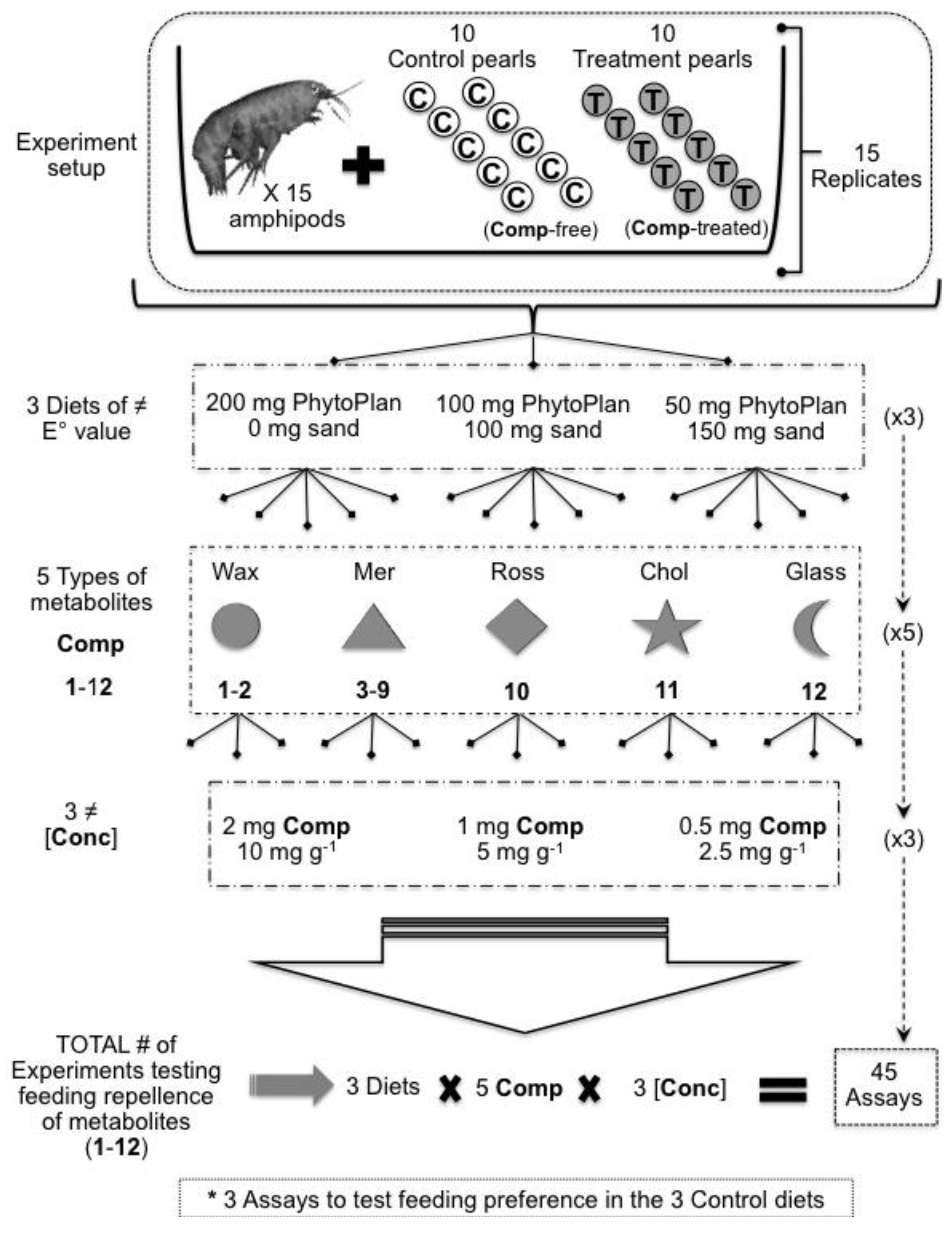 | Compounds Tested | Composition of Artificially Prepared Diets (Feeding Pearls) Compound (mg)/PhytoPlan (mg)/Sand (mg)/Alginate Solution (mL) | [Conc] DWTOTAL (mg·g−1) | [Conc] Volume (mg·mL−1) | ||