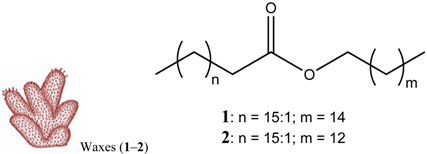 - Wax esters (1–2): The lipophilic (Et2O) fraction from the soft coral Alcyonium haddoni was submitted to silica gel column purification to give a wax ester subfraction (Rf 0.9, light petroleum ether/Et2O, 9:1). LC-MS analysis (250 × 4.60 mm, Phenomenex Kromasil C18, 60 min gradient from 30% to 100% CH3OH in H2O) showed that the wax ester mixture comprised the two main components: wax (1) C34:1 (m/z 529 [M + Na]+), and wax (2) C32:1 (m/z 501 [M + Na]+) (both composed of a C18:1 monounsaturated fatty acid, and C16:0 and C14:0 saturated alcohol esters, respectively). 1–2 were assayed as a mixture, because they are the main components of the wax ester fraction in Alcyonium soft corals. For further details on purification and molecular determination of products 1 and 2 see [27];