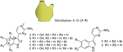 | Meridianins A–G (3–9) | 10 | + | + | + | ||||||