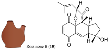 - Rossinone B (10): The Et2O inner extract from the ascidian Aplidium fuegiense was fractioned through column and TLC purifications, allowing to recover significant quantities of the meroterpenoid rossinone B (10) (Rf 0.65, light petroleum ether/Et2O, 2:8). Details on purification and molecular determination of product 10 may be found in [21,28];