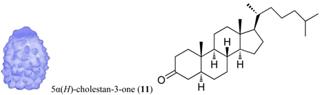 - 5α(H)-cholestan-3-one (11): The ether extract of the glass sponge Rossella nuda was fractioned by silica gel chromatography, using a gradient of light petroleum ether/Et2O. The fraction eluted with 10% of diethyl ether (Rf 0.51, light petroleum ether/Et2O, 8:2) contained pure 5α(H)-cholestan-3-one (11). More information on the isolation of product 11 is published in [26];