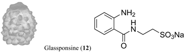 - Glassponsine (12): The fractionation of the BE fraction of the hexactinellid Anoxycalyx (Scolimastra) joubini on Si gel column chromatography (gradient 0%–100% metanol in chloroform) yielded a fraction containing a UV sensitive spot at Rf 0.15 (chloroform/methanol, 8:2). This fraction was further purified by preparative TLC chromatography (SiO2, chloroform/methanol, 65:35) to yield a recently reported pure compound, glassponsine 12, with a structure elucidated by spectroscopic methods elsewhere [29].