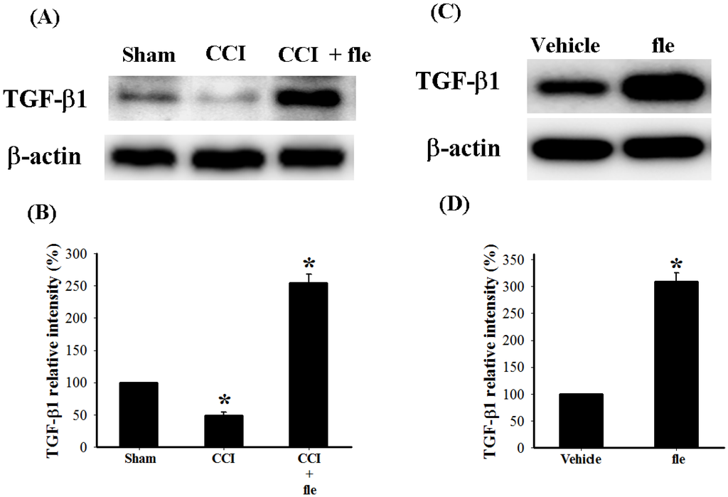 In order to examine the acute effects of flexibilide on spinal TGF-β1 protein expression in CCI rats, i.t. flexibilide (20 μg) was administered once to rats on the 14th day after CCI. We collected tissues from the ipsilateral lumbar spinal DH from sham rats, CCI rats, and CCI rats injected with flexibilide (30 min after injection) for Western blot analysis. As shown in Figure 6A, TGF-β1 protein expression was significantly decreased 14 days after CCI as compared to the sham group. I.t. flexibilide not only attenuated the CCI-induced TGF-β1 downregulation but also significantly upregulated the TGF-β1 expression (Figure 6A). Quantification of the TGF-β1 IR further confirmed this (Figure 6B). In sham-operated rats, i.t. flexibilide (20 µg) alone significantly upregulated TGF-β1 expression in the ipsilateral lumbar spinal DH (Figure 6C). Quantification of the TGF-β1 IR also confirmed that TGF-β1 levels were significantly increased 30 min after i.t. flexibilide in sham-operated rats (Figure 6D).