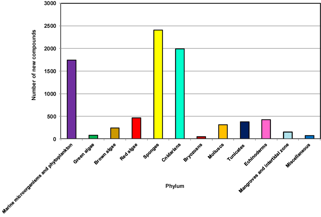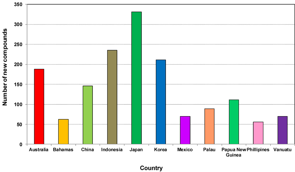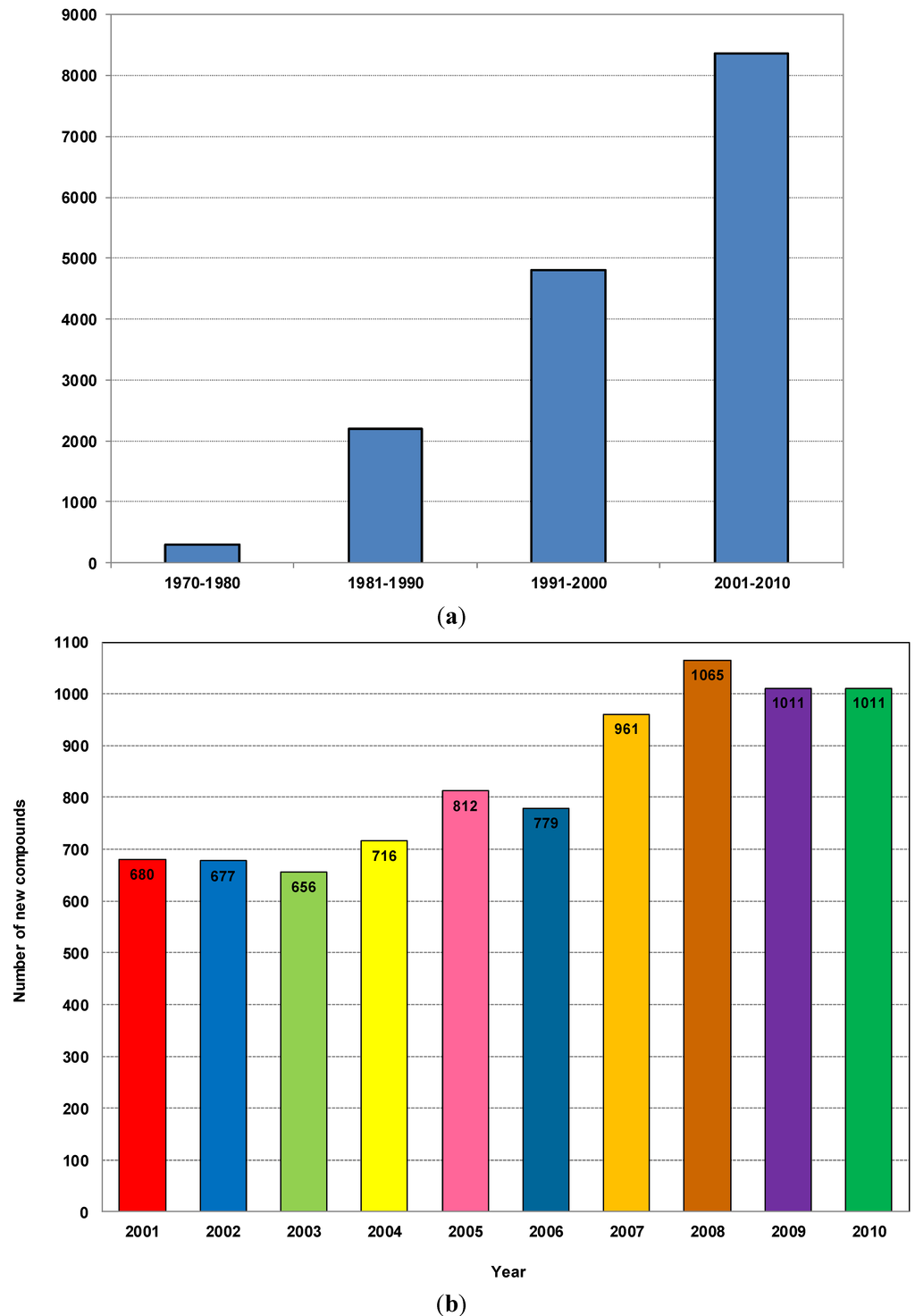 The discovery of marine natural products has accelerated over the last two decades with the number of new compounds discovered annually increasing from 20 to more than 200 [10]. It has been estimated that by 2010 more than 15,000 new marine natural products (NMNP) had been discovered [11,12,13] with 8368 new compounds recorded for the decade between 2001 and 2010. This constitutes over half of all the compounds discovered since 1951.