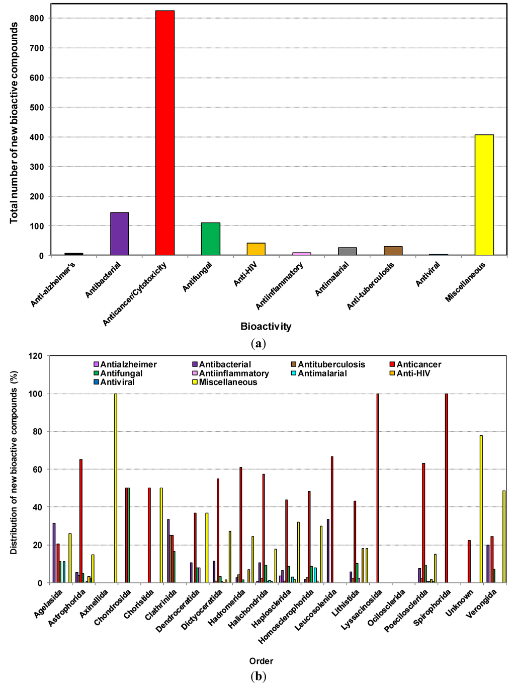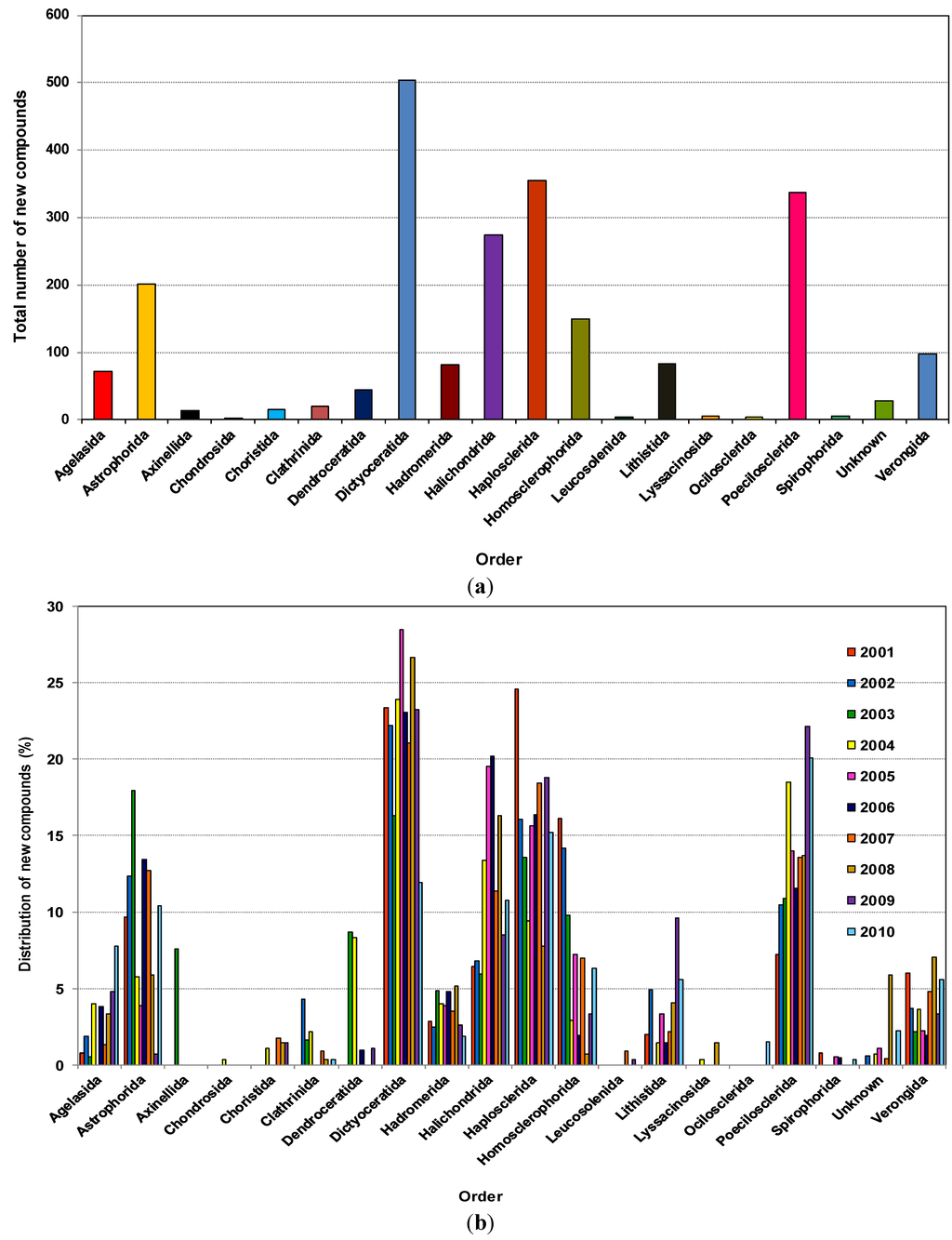 (a) Total number of new compounds isolated from different orders of marine sponges 2001–2010; (b) Distribution of new compounds isolated from different orders of marine sponges as a percentage found within the year, 2001–2010.