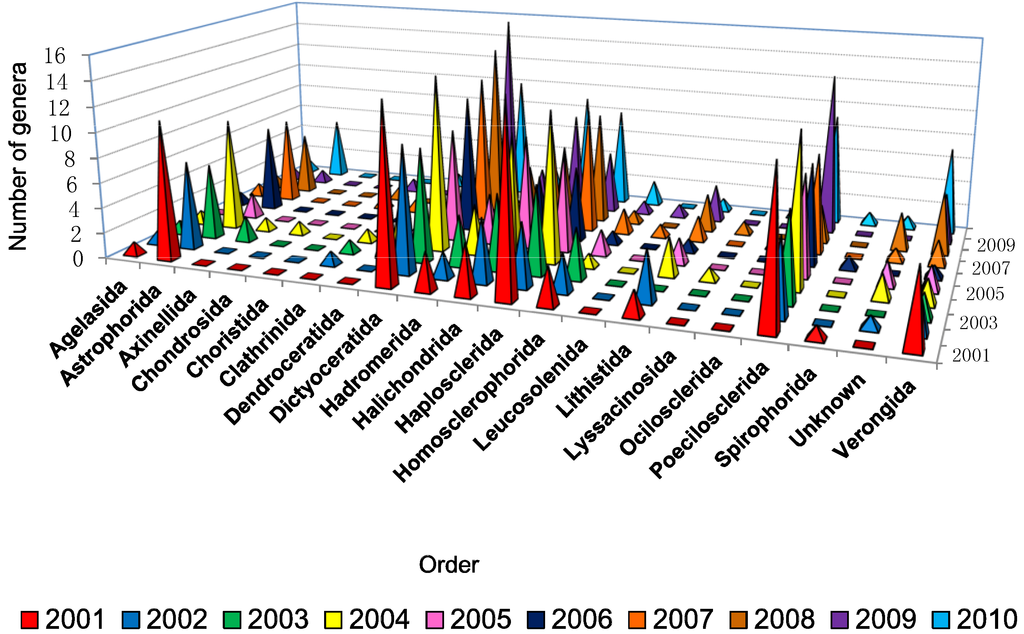 Figure 4 shows that between 9 and 16 genera were found to produce new molecules each year from the order Dictyoceratida which revealed a high availability of different genera from this particular order, with the highest number found in 2009. This order will be examined in greater detail in a subsequent review covering 2001–2010. Genera belonging to the orders Haplosclerida, Halichondrida, Poecilosclerida, and Astrophorida also showed more than five productive genera for most of the last decade. The number of new compounds correlated with the high diversity of sponges because the higher the diversity the higher the possibility of getting more novel compounds. Another possible reason that makes Dictyoceratida the most prolific producers of NMNP as well as Astrophorida, Haplosclerida, Homosclerophorida and Halichondrida is because these orders harbor high densities of microorganisms [25,85].