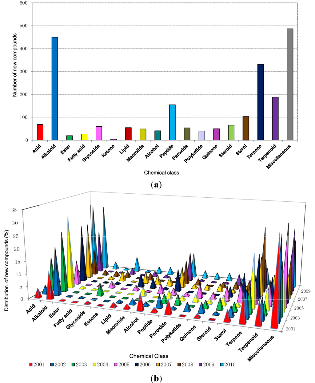 A wide range of chemical and functional diversity has been observed among new compounds during the last decade. The analyzed data (Figure 5a) has shown that in the last ten years 450, 331, 188 and 155 new compounds were classified as alkaloids, terpenes, terpenoids and peptides, respectively, and these four classes make up approximately 50% of compounds discovered. While alkaloids contributed 20% of the new molecules the terpene/terpenoid classification which are often not readily distinguishable, together made up 23% of the total within the decade.