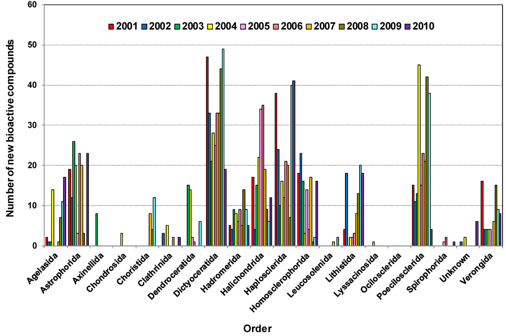 Total number of new compounds isolated from different orders of marine sponges with different bioactivities from 2001 to 2010.