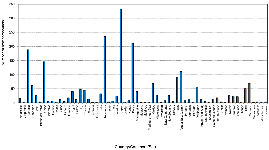 During the recent decade the sponges collected were from 19 known orders as well as 12 sponges of unknown identity which provided new compounds. These included Agelasida, Astrophorida, Axinellida, Chondrosida, Choristida, Clathrinida, Dendroceratida, Dictyoceratida, Hadromerida, Halichondrida, Haplosclerida, Homosclerophorida, Leucosolenida, Lithistida, Lyssacinosida, Ocilosclerida, Poecilosclerida, Spirophorida and Verongida. Sixty two countries (with Antarctica labeled as a country for reporting purposes) were the sources for the sponge samples studied. The bioactivities were mainly classified as anti-Alzheimer’s, antibacterial, antituberculosis, anticancer, antifungal, anti-inflammatory, antimalarial, antiviral and anti-HIV.