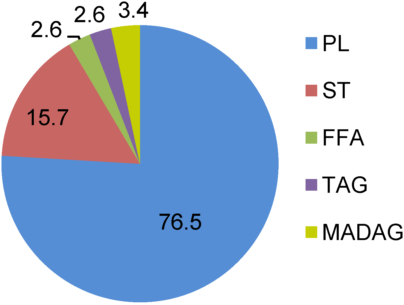 Lipid classes (% of total lipids) of nudibranchs. Results are expressed as the mean of eighth species (n = 8). PL, phospholipid; ST, sterol; FFA, free fatty acid; TAG, triacylglycerol; MADAG, monoalkyldiacylglycerol.