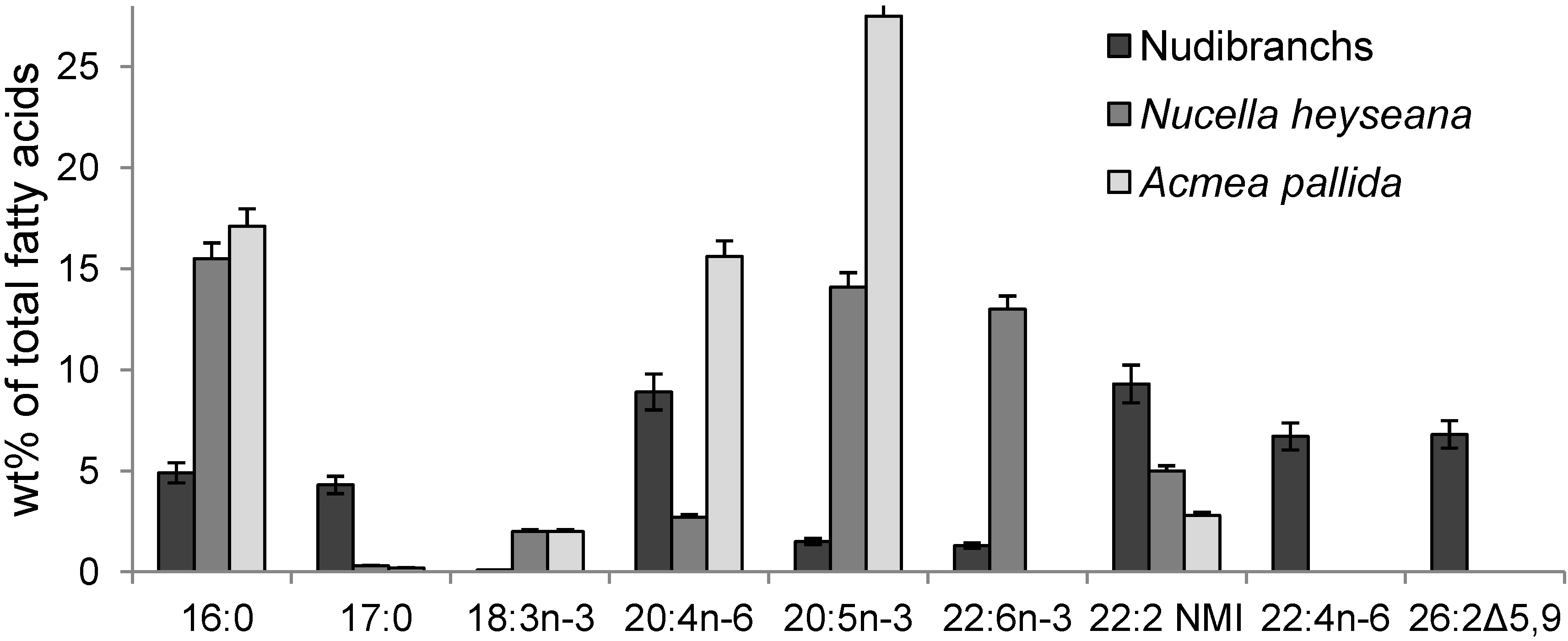 Fatty acid composition (wt%) of nudibranchs. Results are expressed as the mean ± SD of eight studied species.