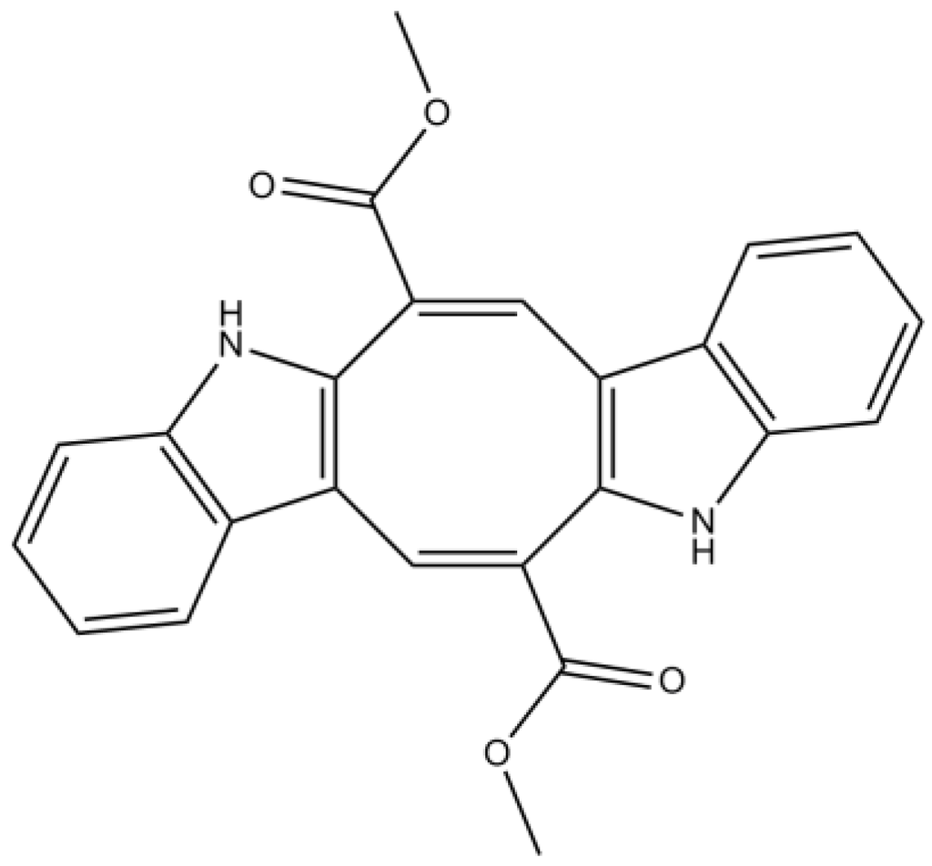 The indole alkaloids group comprises a large number of structurally diverse metabolites, such as bisindole alkaloids biosynthesized by a wide range of organisms. Different marine organisms, including macroalgae, provide numerous unique and intriguing bisindole alkaloids, which exhibit excellent bioactivities, thus attracting great interest from researchers [72,73]. De Souza et al. [74] have demonstrated that caulerpin (Figure 7), a bisindole alkaloid isolated from the lipoid extracts of Caulerpa racemosa (Forsskål) J. Agardh, collected in the Northeast of Brazil, was able to suppress inflammatory processes, probably as a result of an antioxidant effect and the inhibition of key enzymes involved in inflammation, such as cyclooxygenase (COX). The indole group of caulerpin is thought to be responsible for the prominent anti-inflammatory activity of this alkaloid [74].