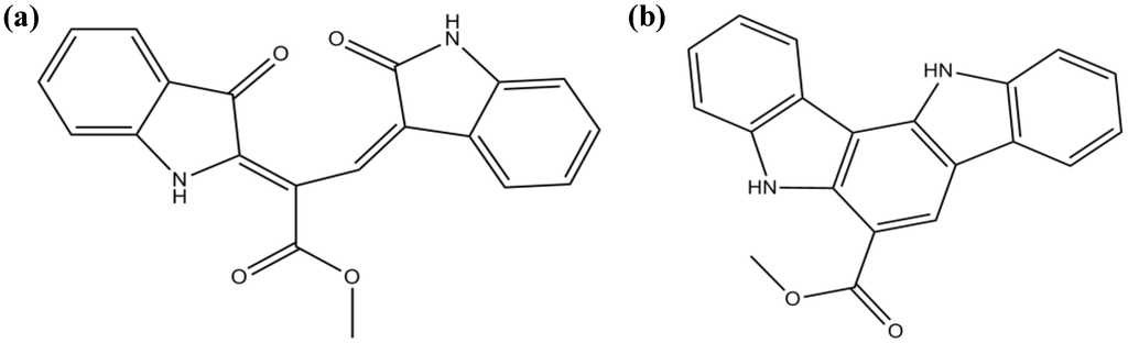 Recently, two novel bisindole alkaloids, racemosins A and B, were isolated from C. racemosa (from the East China Sea) [73]. Racemosin A (Figure 8a) possesses a unique seco-indolo[3,2-α]carbazole skeleton with two indolinenone units, both conjugated with a methyl propenoate moiety, racemosin B (Figure 8b) being its cyclized derivative. Both alkaloids were evaluated in vitro for neuroprotective activity against Aβ-induced SH-SY5Y cell damage. The human neuroblastoma cell line SH-SY5Y is currently used in studies of neuroprotection as in vitro-simulated ischemia model. SH-SY5Y cells are generally known to be sensitive to oxidative stress and to express glutamate receptors [75]. The two compounds showed a certain degree of neuroprotection, racemosin A being the most powerful agent, which suggests that the distinctive scaffold of this particular alkaloid can be responsible for the modulation of important processes involved in neurodegeneration [73].