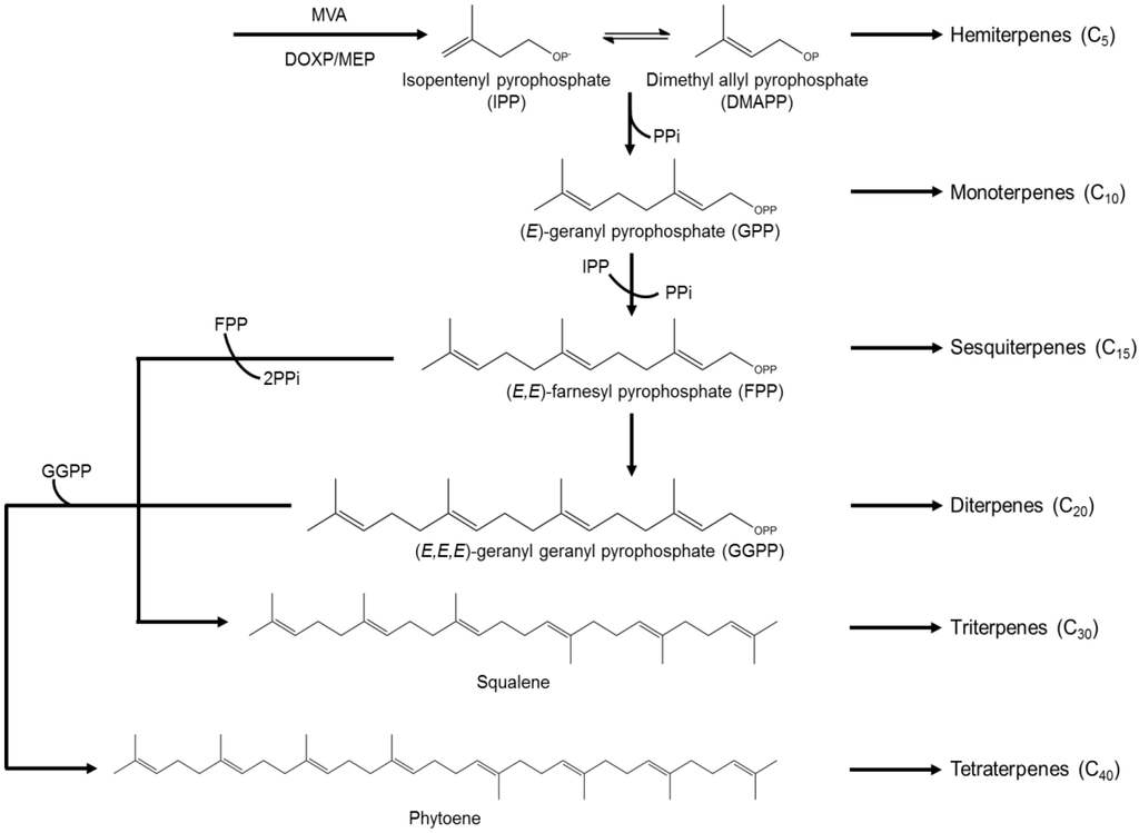 Schematic representation of the biosynthesis of the major subclasses of terpenes. Monoterpenes (C10), sesquiterpenes (C15) and diterpenes (C20) are derived from the corresponding intermediates, by sequential head-to-tail addition of C5 units. Triterpenes (C30) result from two C15 units linked head-to-head and tetraterpenes (C40) are formed from two C20 units, also joined head-to-head.